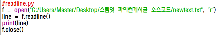 [하나하나Python] 04. 프로그램의 입력과 출력은 어떻게 해야 할까? - 3_7chainsmokerslav (62)in kr-dev 커뮤니티 • 3 years ago (edited) [04. 프로그램의 입력과 출력은 어떻게 해야 할까?] -3. 파일 읽고 쓰기 ===================프로그램의 외부에 저장된 파일을 읽는 여러 가지 방법 : 파이썬에는 외부 파일을 읽어들여 프로그램에서 사용할 수 있는 여러 가지 방법이 있다. 해당 방법을 자세히 알아보자. -readline 함수 사용하기 첫 번째 방법으로 readline함수 사용방법이다. 아래 예시를 보자. #kr-devteam #kr-dev #krsuccess #aaa #kr-steem #steemit #python