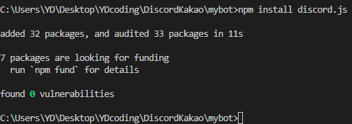 npm install discord.js 명령을 통하여 discord.js를 인스톨 하였습니다..