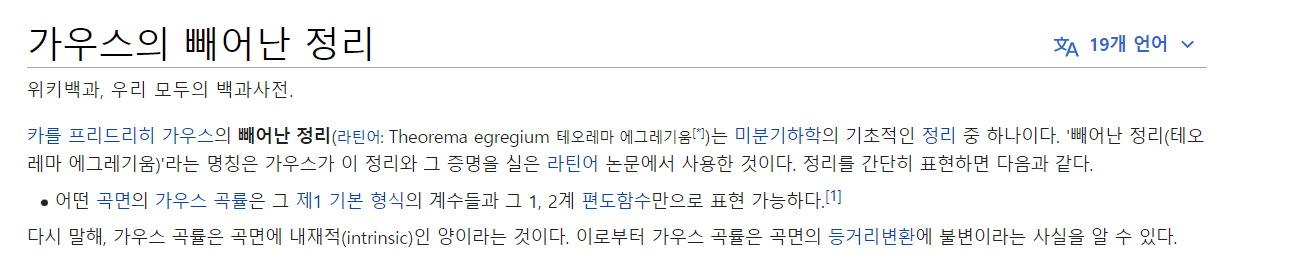 흠.... 아쉽게도 예전에 내가 정리해 둔 미분기하학 노트를 보면 Gauss-Bonnet theorem 은 그래도 결과랑 응용들을 잘 정리해 두었는데 가우스의 위대한 정리는 Riemannian tensor 계산 형식으로만 정리해두고 계산 증명만 적어놓아서 이 글에선 그렇게 필요한 자료는 아닌 듯 싶다.