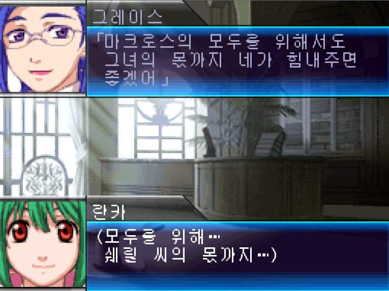 그레이스 : 셰릴은 아직 입원중이야. 돌아와도 둘을 동시에 돌보는 정도는 일도 아니지. 마크로스의 모두를 위해서도 그녀의 몫까지 네가 힘내주면 좋겠어.
