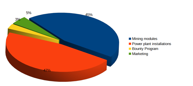 Use of collected funds 47% of the collected funds will be spent on the construction of a facility that generates its own power. 45% of the collected funds will be spent on the construction of mining modules and the purchase of mining equipment. These will be installed for the period of construction of the plant with its own generation at our operational mining farm with electricity tariffs of 0.05c per 1 kW / h, which will allow holders of FGY tokens to immediately begin earning revenue from mining.
