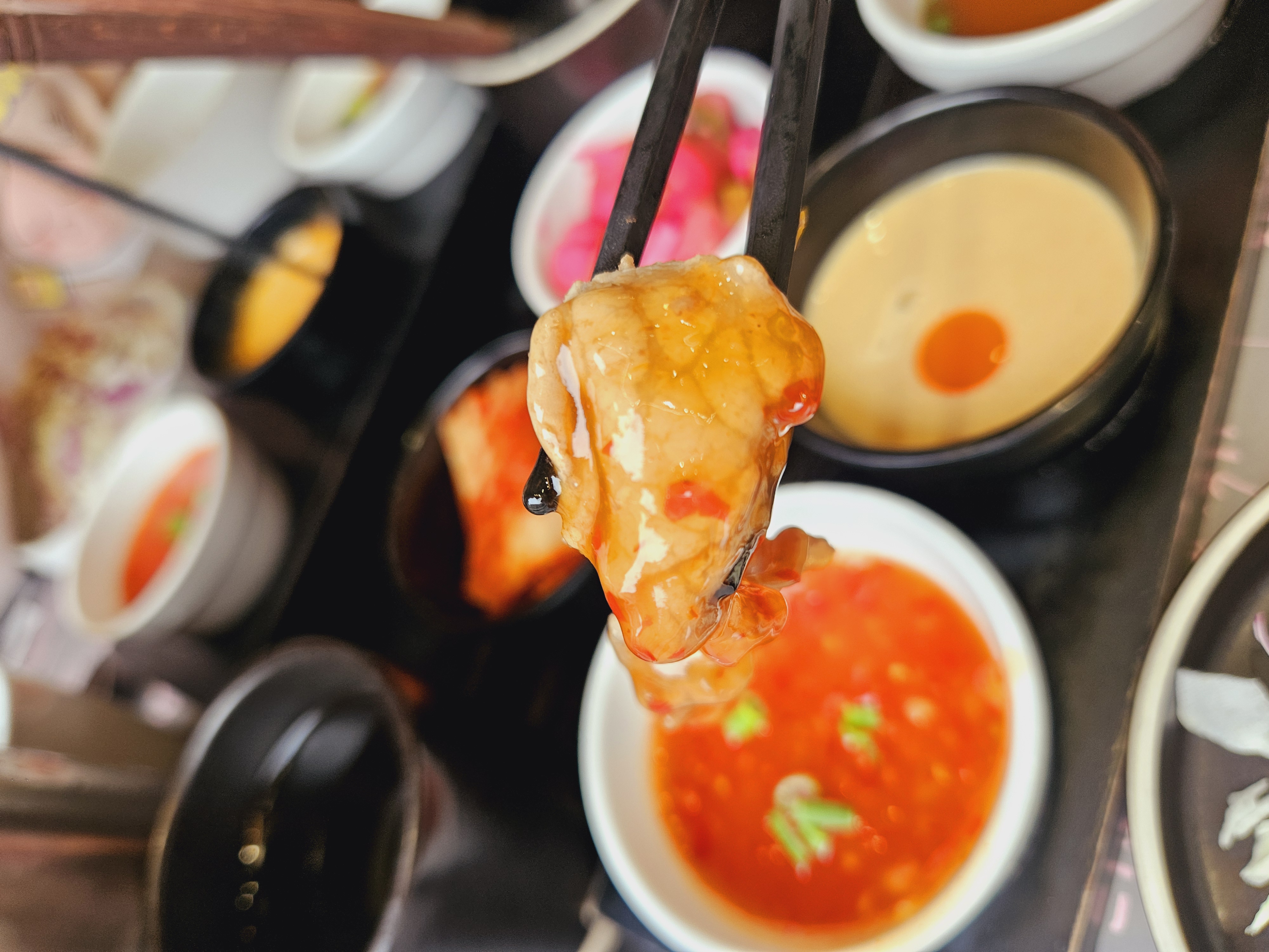 잘익힌 샤브샤브 고기와 야채를 칠리,땅콩,간장 소스 서로 번갈아가며 먹는 맛이 꿀맛이랍니다.