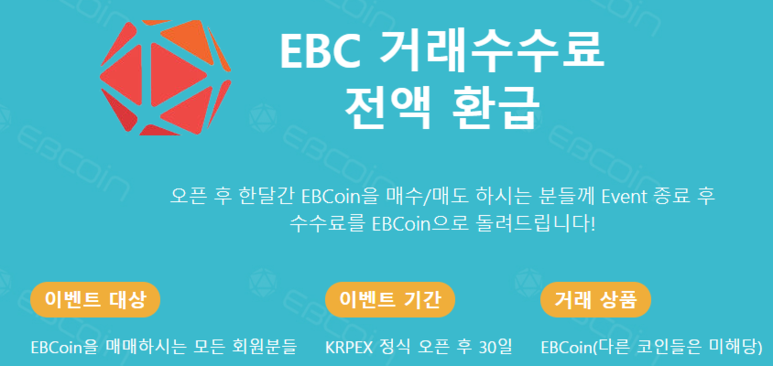 오픈 후 한달간 EBcoin 매수/매도시 수수료를 EBcoin으로 환급해준데요!