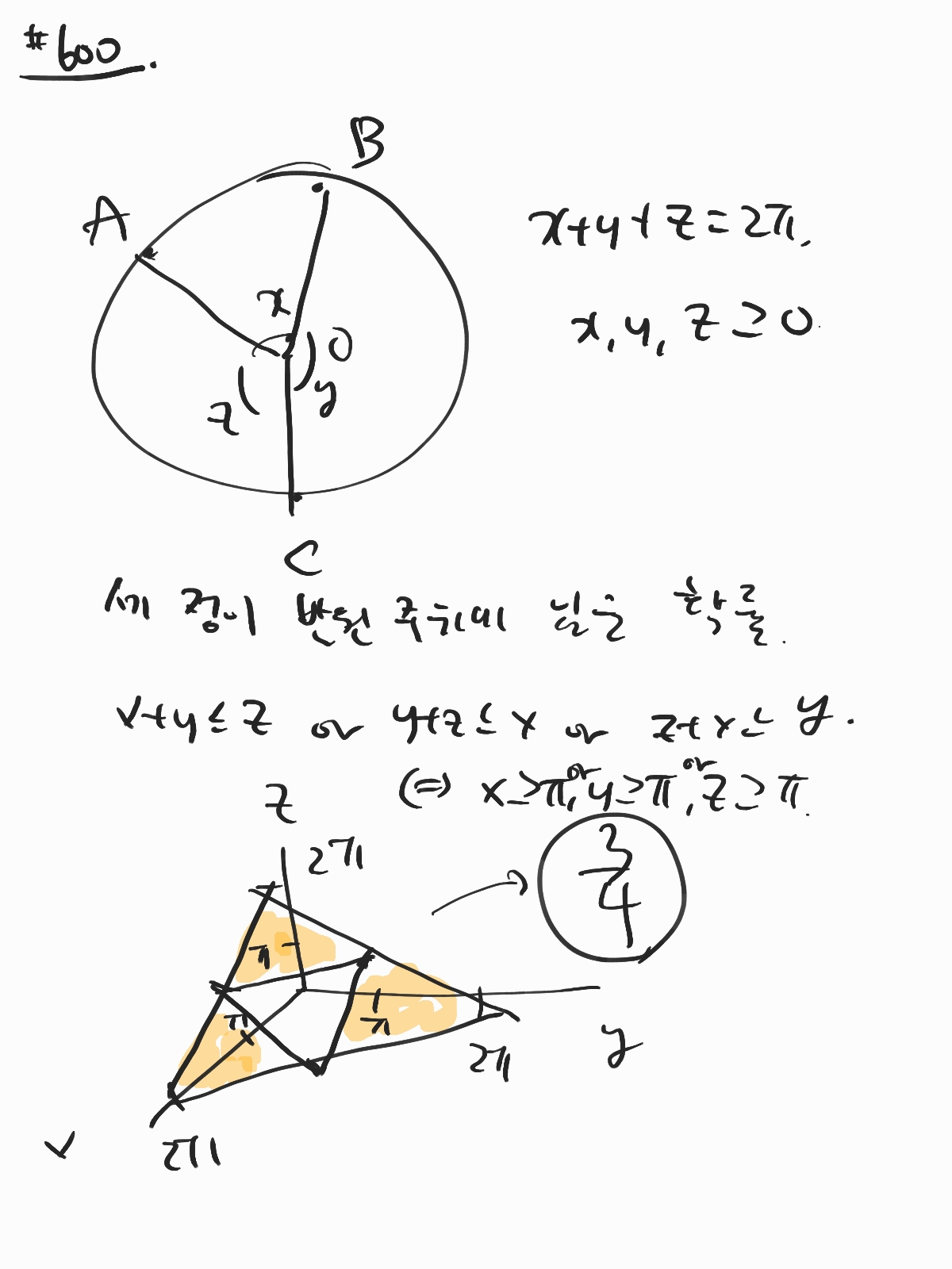 주어진 원 둘레 위에 임의로 3점을 찍는다. 이 떄 이 3점이 반윈 주위에 있을 확률을 구해라.