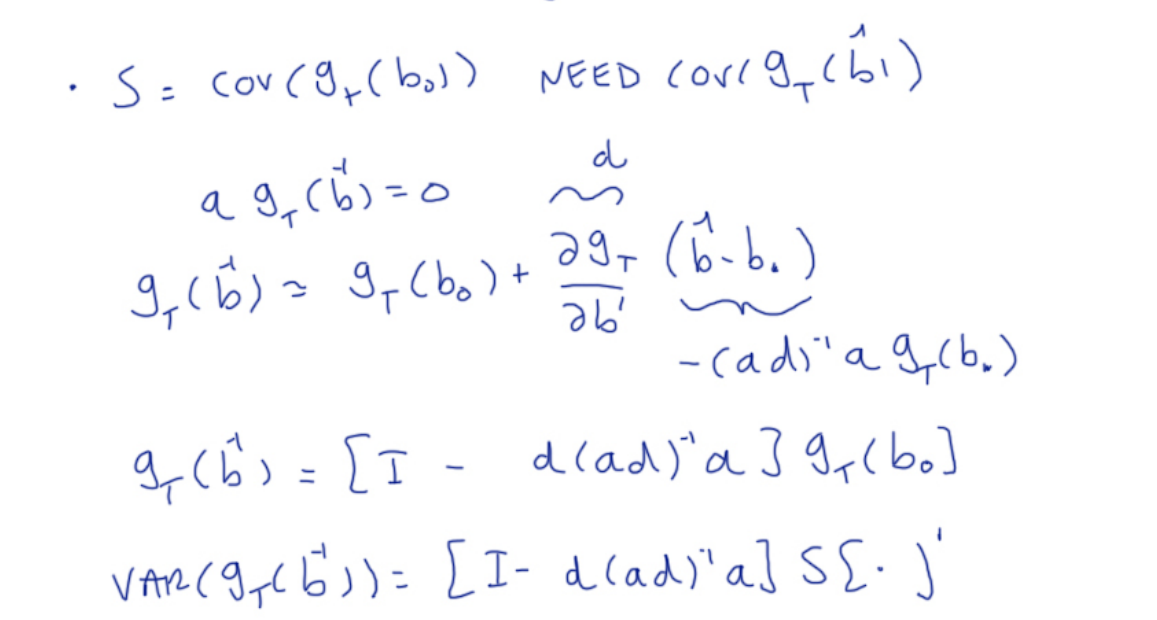 b_T - b 를 구한다. [책에서는 Hansen (1982) 의 논문의 결과 만을 state 하고 있다. 강의에서는 좀 더 설명을 해 주고 있긴 하다. 강의의 부록 노트에는 a_T g_T(b_T) =0 의 taylor series 로부터 복잡한 var(g_T(b_T)) 공식을 얻어낸다.