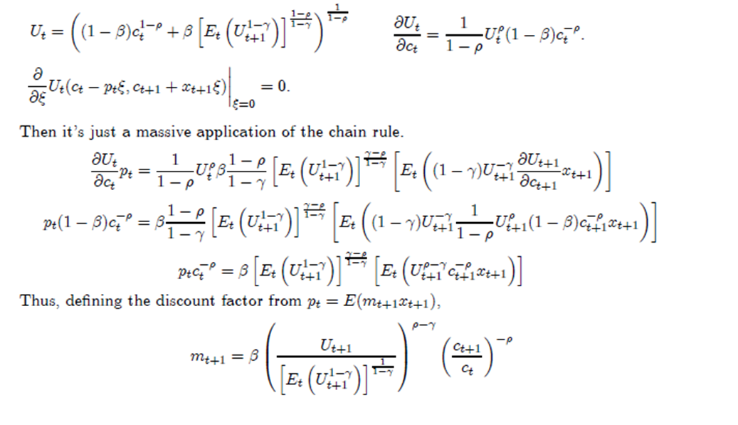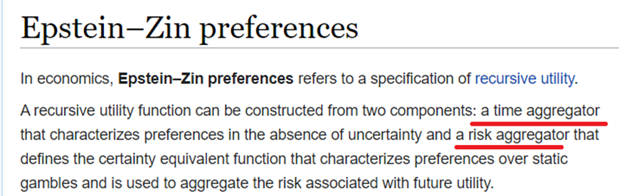 Utility 함수 자체가 재귀적으로 생겼고 time 과 risk aggregator 로 이루어져 있다고 한다. aggregator 하면 모으는 것을 말하는 건가? wiki 를 봤는데도 아직 저 두 용어가 정확히 뭘 말하는지 이해가 안간다. Cochrane 의 강의에서는 Habit 이나 Recursive 나 특별한 말 없이 수식만 주고 계산하면 공식을 유도할 수 있고 그래서 이렇다 정도로만 설명하는데