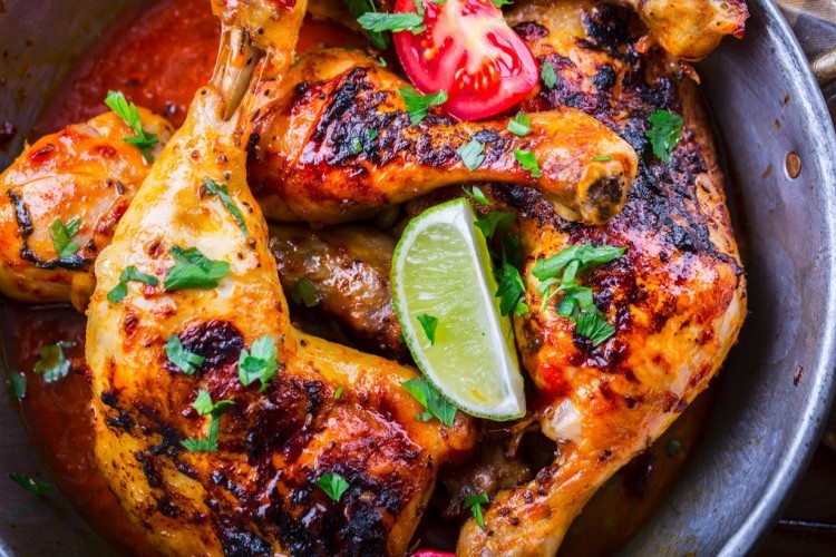 양념한 닭고기를 오븐 쟁반에 담고 은박지로 덮고 중불에서 1시간 동안 닭고기가 익을 때까지 둔다.