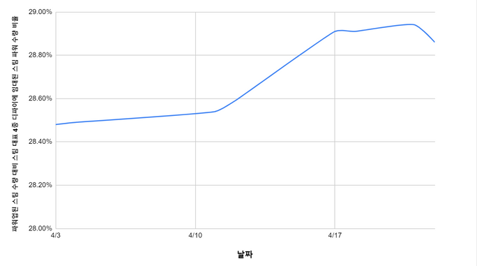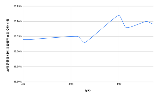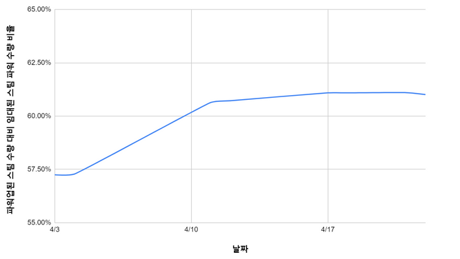 스팀 델리게이트 4 DeFi에게 대여한 스팀 파워와 스팀 충전량의 비율 그래프.