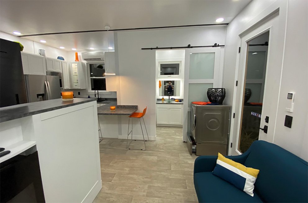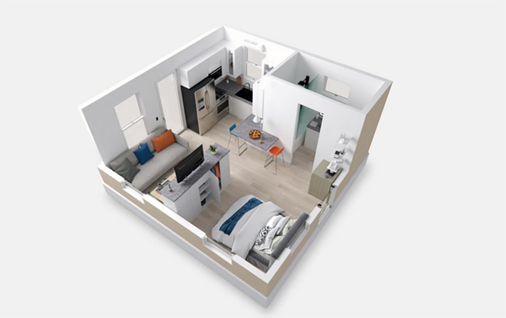 38제곱미터의 모듈러 하우스는 '작은 집'을 컨셉으로 설계되었습니다. Boxabl이 디자인한 집은 거실, 화장실, 침대, 주방으로 구성되어 있습니다.