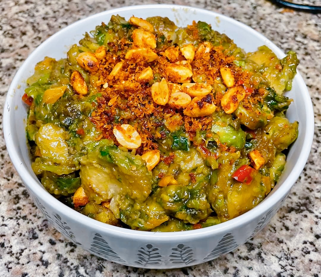 방울양배추가 완벽하게 구워지면 크리미한 불맛이 나는 소스를 방울양배추 전체에 뿌려서 매콤한 맛을 입혔습니다. 그런 다음 구운 땅콩 토핑을 뿌려주면 요리가 빛날 준비가 끝났습니다.