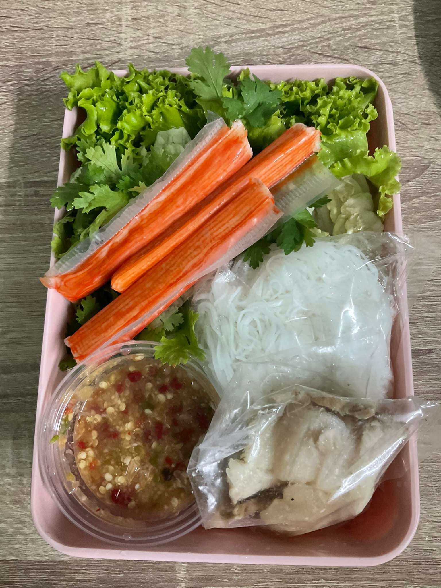 2 เอาเส้นหมี่ไปเเช่น้่ำจนนิ่มเเล้วเอาไปลวก สะเด็ดน้ำใส่กระเทียมลงไปคลุกเพิ่มความหอม