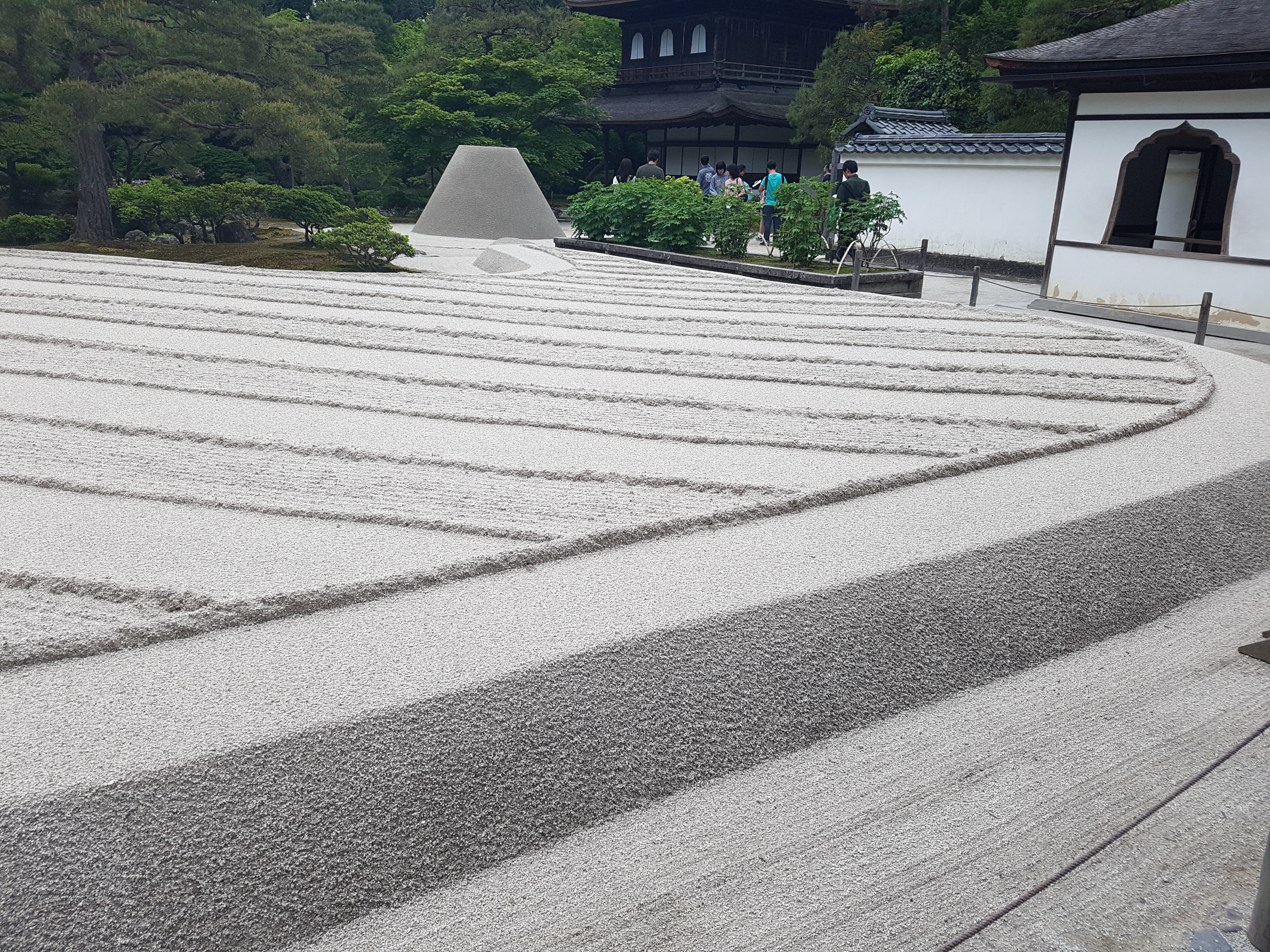 하지만, 은각사만의 특징이 있다면 바로 이 은사탄입니다. 은빛 모래 바다라는 이름을 가진 이 구조물은 모래정원으로 바다를 연상케하는 물결 무늬가 특징입니다. 밤에는 이 곳에 달빛이 반사된다고 하는데... 야간개장기간이 있다면 구경 가능할지도 모르겠군요! 여담으로 저기 원통형으로 솟아있는 구조물은 향월대(向月臺)라고 합니다.