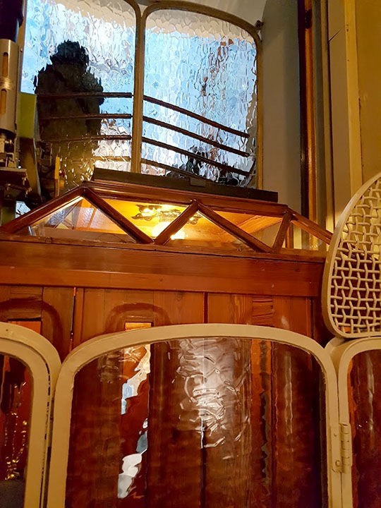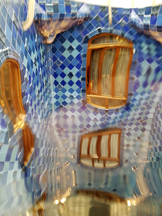 까사 바뜨요 역시 독특한 모습이 인상적입니다. 도로 쪽으로 나 있는 큰 창이 참 기억이 나는데 목조로 짠 구불구불한 창틀은 환기를 위한 조절 가능한 구멍이 있습니다. 창 또한 사각형이 아니고 구불구불하고 스테인드글라스로 만들어진 상단은 실내로 바로 들어오는 햇빛을 줄여 줍니다. 창 너머로는 기둥이 보이고 그 너머로 거리가 보여요. 계단을 관통하는 엘리베이터도 범상치 않게 생겼습니다. 계단에서는 건물 안의 정원을 볼 수 있어요. 정원으로 나 있는 창문과 창틀은 파란색 계통 타일로 주변이 마무리되어 있는데 역시 구불구불합니다. 계단 난간에 있는 울렁거리는 유리창 너머로 보이는 구불구불하면서 푸르스름한 타일 벽은 카사 바뜨요를 요약한 모습이지요. 현관은 푸른 타일로 장식되어 있고 목제 현관문도 밋밋하지 않게 다양한 곡선을 가지고 있습니다. 현관에 적힌 알파벳 표식도 가우디의 건축처럼 독특하지요.