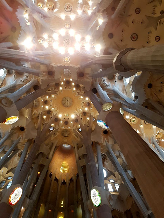 건물 외부처럼 내부도 여러 사람이 참여한 게 보입니다. 좀 독특한 건 전기 냄새가 난다는 점이에요. 지금까지 여행에서 제가 본 성당과 다르게 조명이 현대적입니다. 스테인드글라스가 해야 할 역할을 조명 확산판에 그려진 그림이 하기도 해요. 이 성당 건축의 대장 격인 가우디가 죽었으니 건축이 길을 잃는 건 당연할 겁니다. 아무리 큰 얼게는 남아 있어도 있어도 직접 건축하며 생기는 작은 부분 하나하나를 모두 생각해 놓을 순 없습니다. 아무리 정확한 도면을 들고 건축해도 늘 생각지도 못한 문제가 생기기 마련이지요. 작게 짓거나 가상으로 짓기도 하지만 건축하며 생길 수 있는 모든 일을 기술하는 건 같은 크기 모형을 지어보는 게 아니면 불가능합니다.