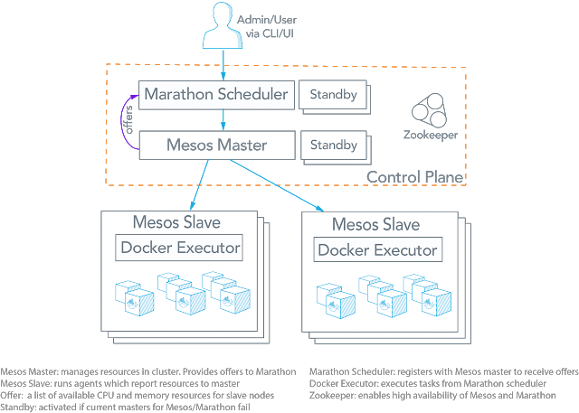 CLI or UI를 사용할 수 있고, JSON으로 정의하여 Docker Container의 저장소, 리소스, 인스턴스 수 및 실행할 명령을 지정할 수 있습니다. Marathon UI를 사용하여 스케일업을 수행 할 수 있고 Marathon Scheduler는 지정된 조건에 따라 Slave Node에 Container를 분배합니다.