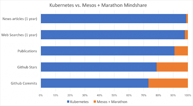Kubernetes와 Mesos + Marathon에 대한 관심도를 살펴보면 Kubernetes가 뉴스 기사, 웹 검색, 출판물 및 Github 대상 모든 측정 항목에서 70% 이상을 차지하고 있음을 알 수 있습니다.