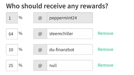 10% wird DUBby für sinnvolle, sinnfrei oder jede andere Beitragsreaktionen verteilen. 1% für Friseur & Visagisten, 64 % an steemchiller als Werbeplatzinhaber und 25% werden verbrannt, damit die verbleibenden 75% eine Einhunderttrölf-prozentige Wertsteigerung bekommen. Win-Win-Win sozusagen.