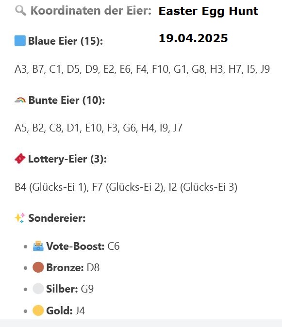 Wie vereinbart werden alle nicht gefundenen Eier in der Gesamtsumme an alle Teilnehmer der lustigen Ostereier-Suche verteilt. Auf der Osterwiese sind 3 blaue Eier, 5 bunte Eier, 1 Lotterie Ei, das Vote-Boost Ei, das bronzene und das silberne Ei liegen geblieben.