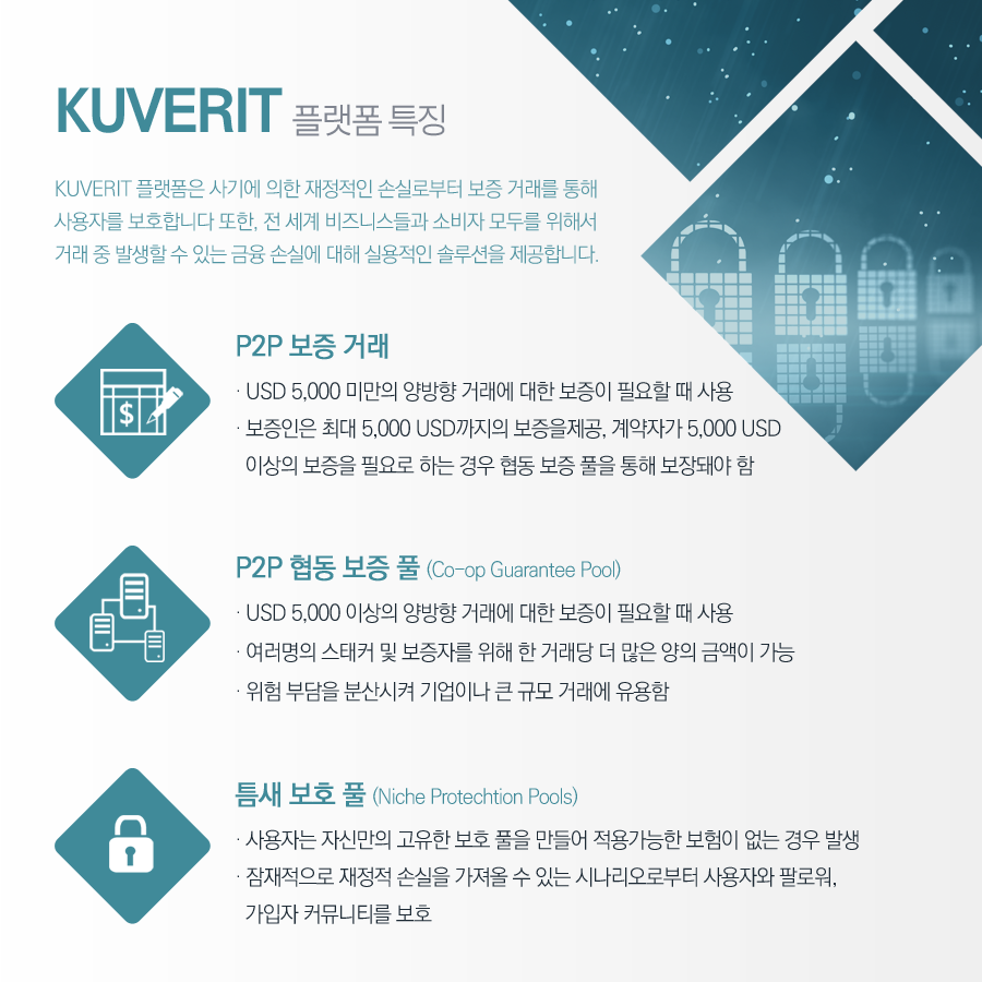 쿠버렛(Kuverit) 플랫폼은 다양한 방법으로 사용되는 것이 가능하지만 플랫폼의 주요 역할과 목표는 P2P 사기를 방지하고 사기로 인한 금전적인 피해로부터 사용자를 보호하는 것이라고 합니다.