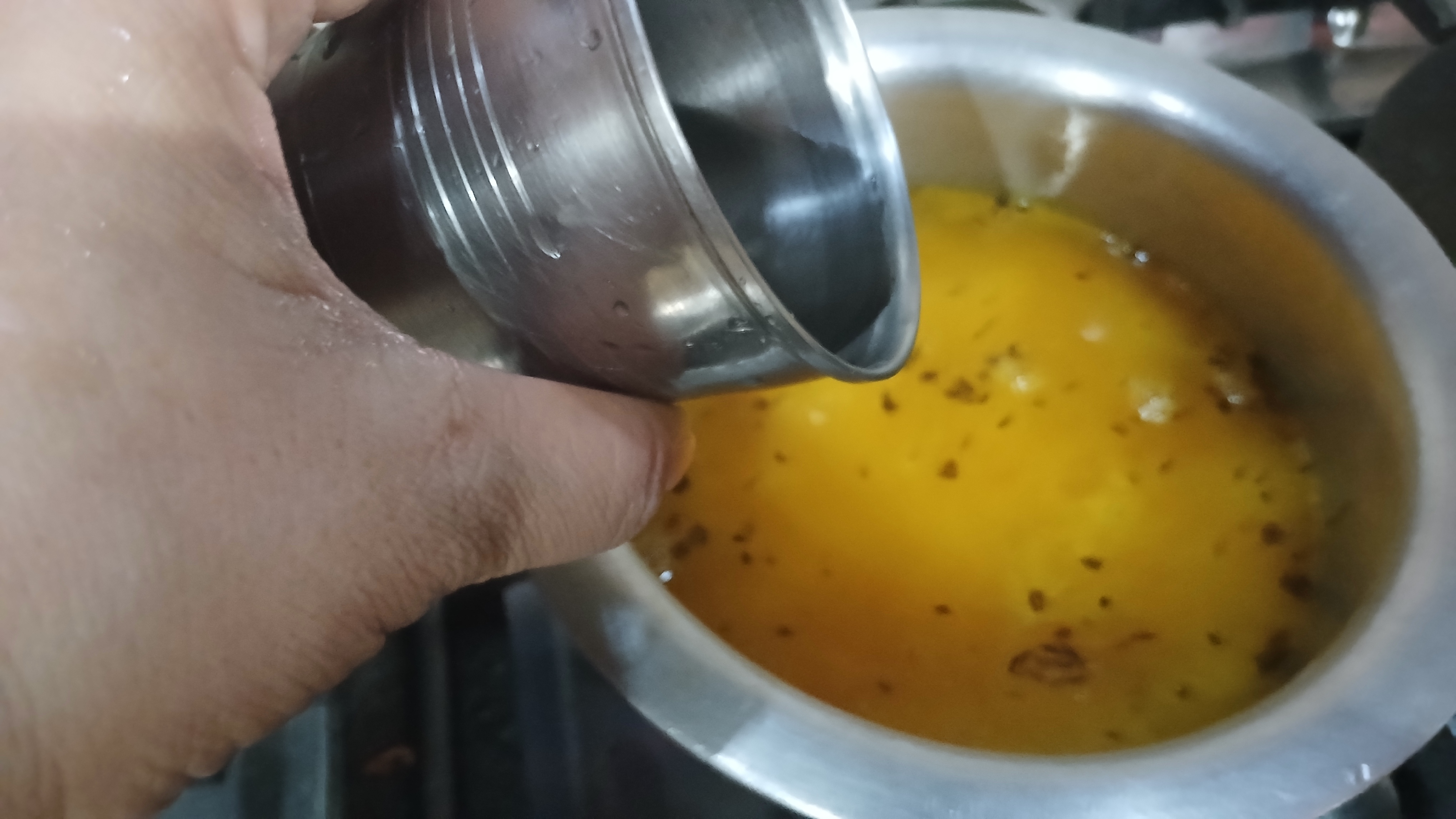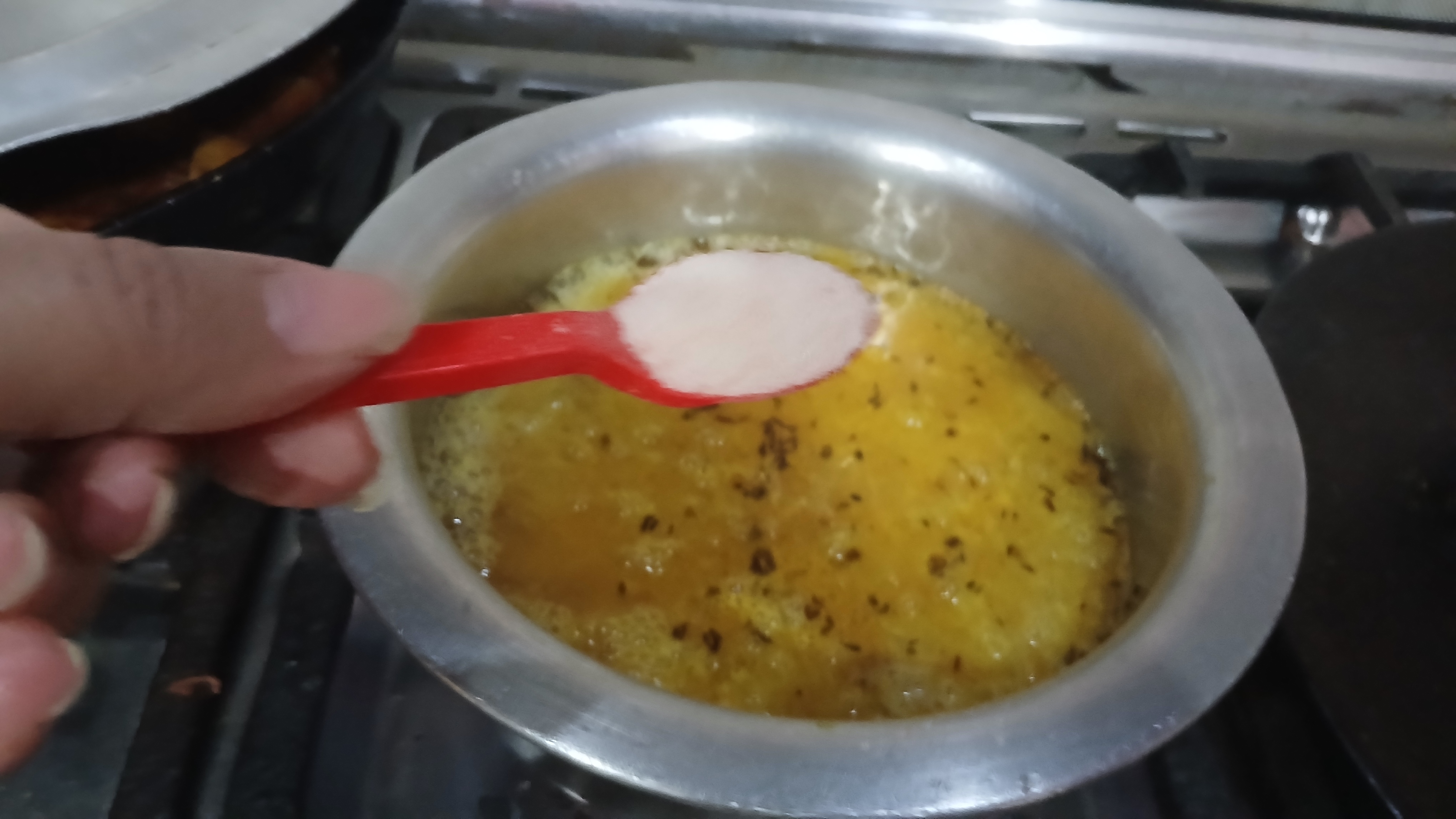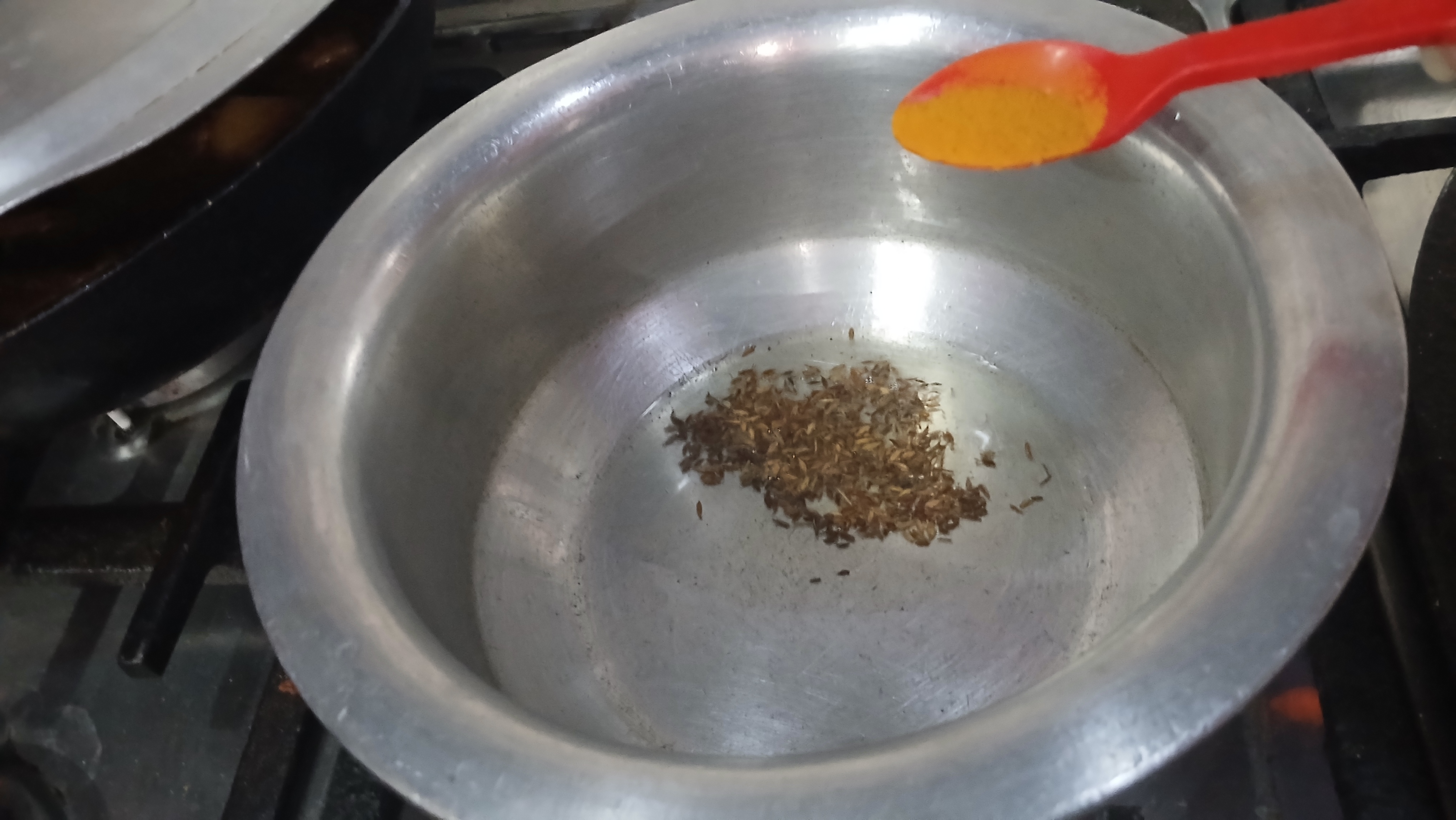 - Take ghee in a pan and fry cumin seeds in it for a while then add turmeric powder in it and cook it for 30-second.