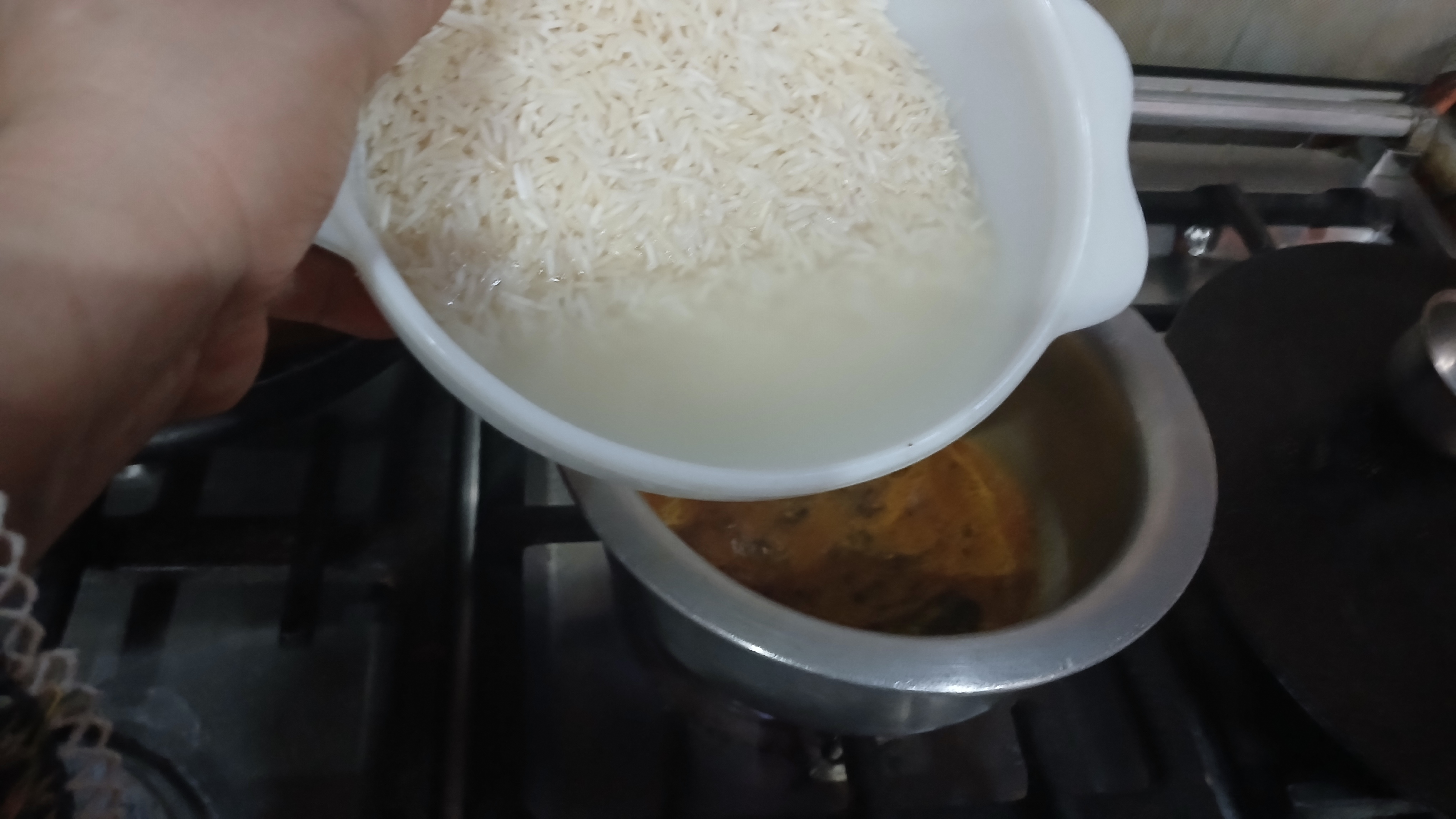 - Add soaked fenugreek and soaked rice in pan .