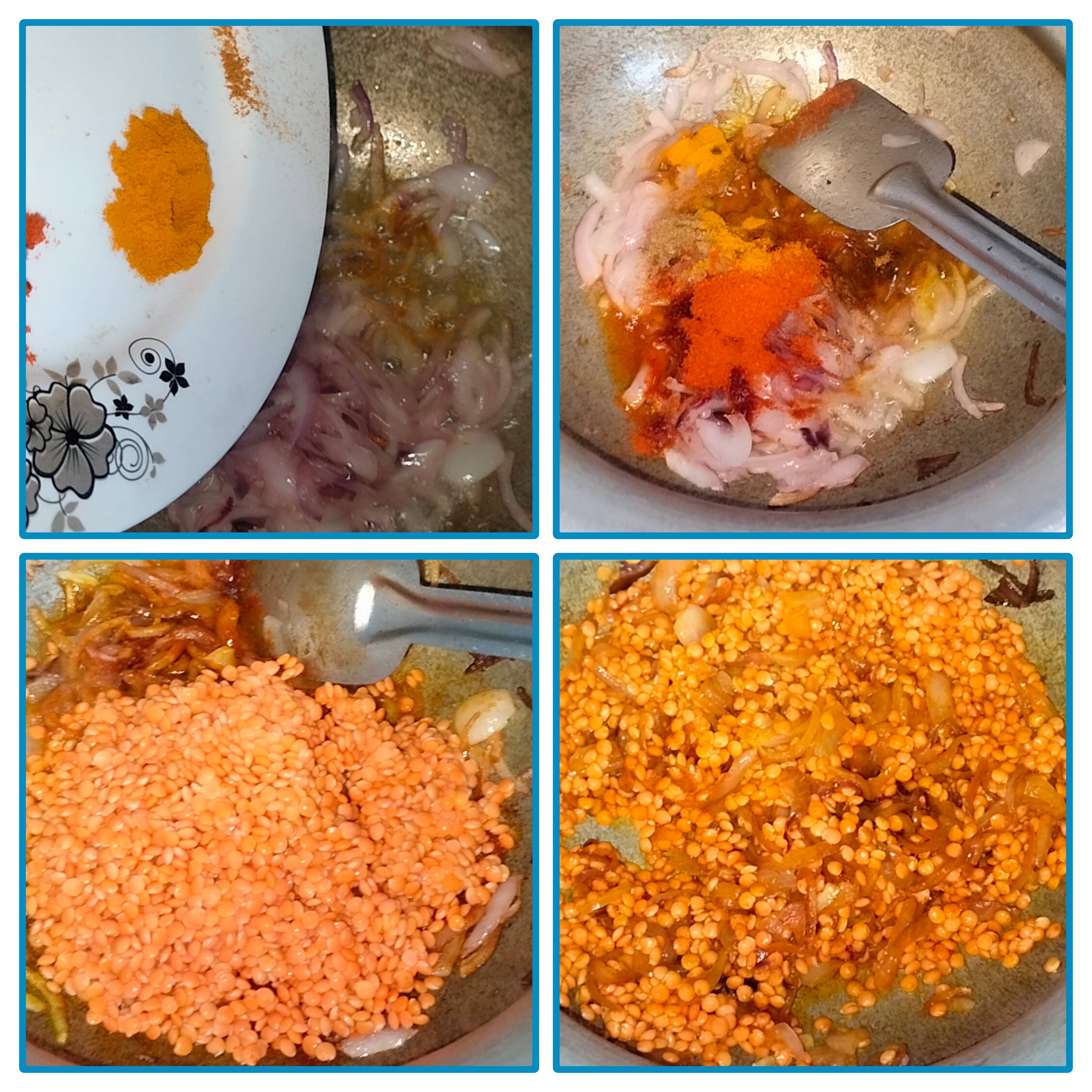 Then I added all the spices to it. I stirred the spices for a while and fried them. Then I added the lentil dal to it. I mixed them.