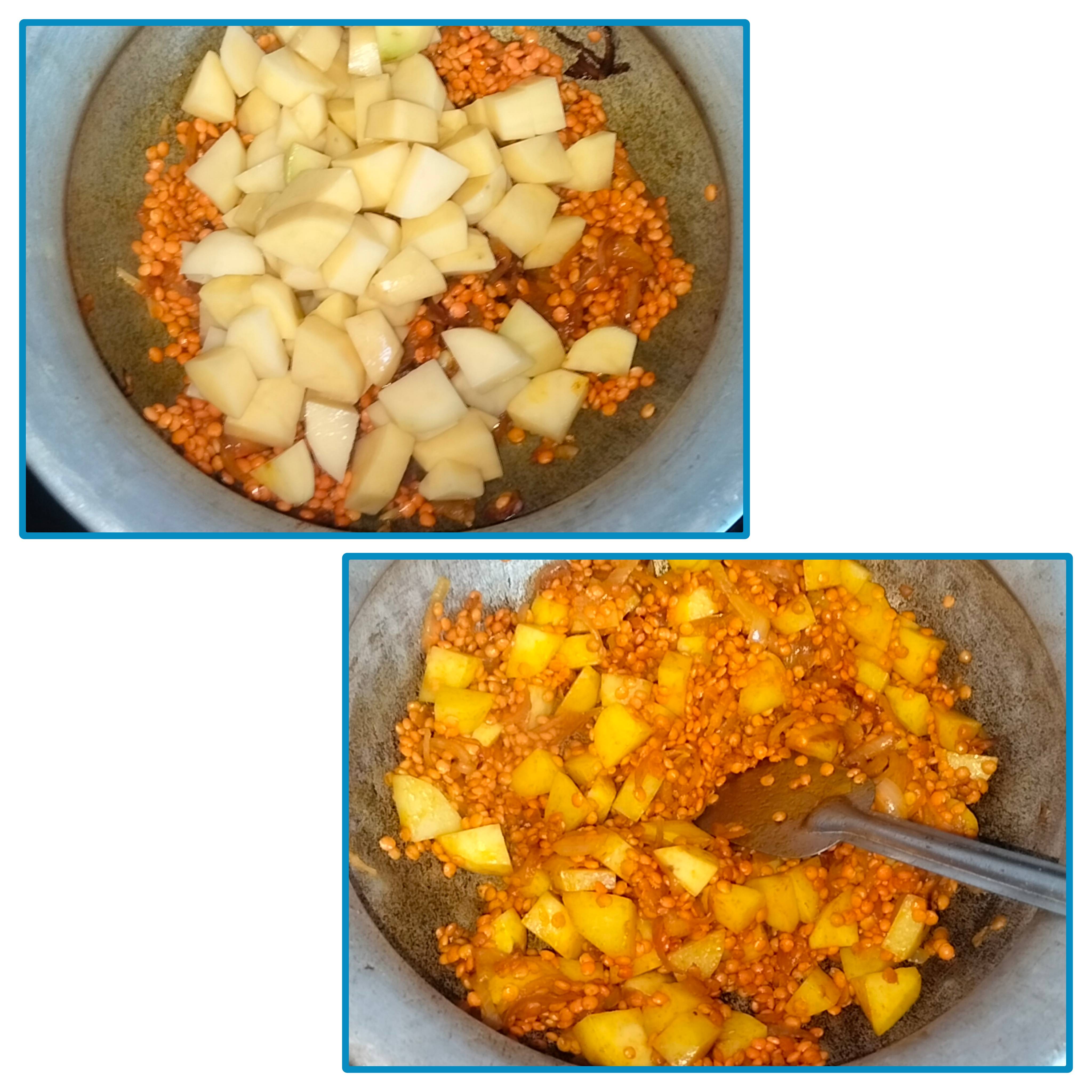 Then I added the potato pieces to it. I added the potato pieces and then stirred them well. I fried them for a while.