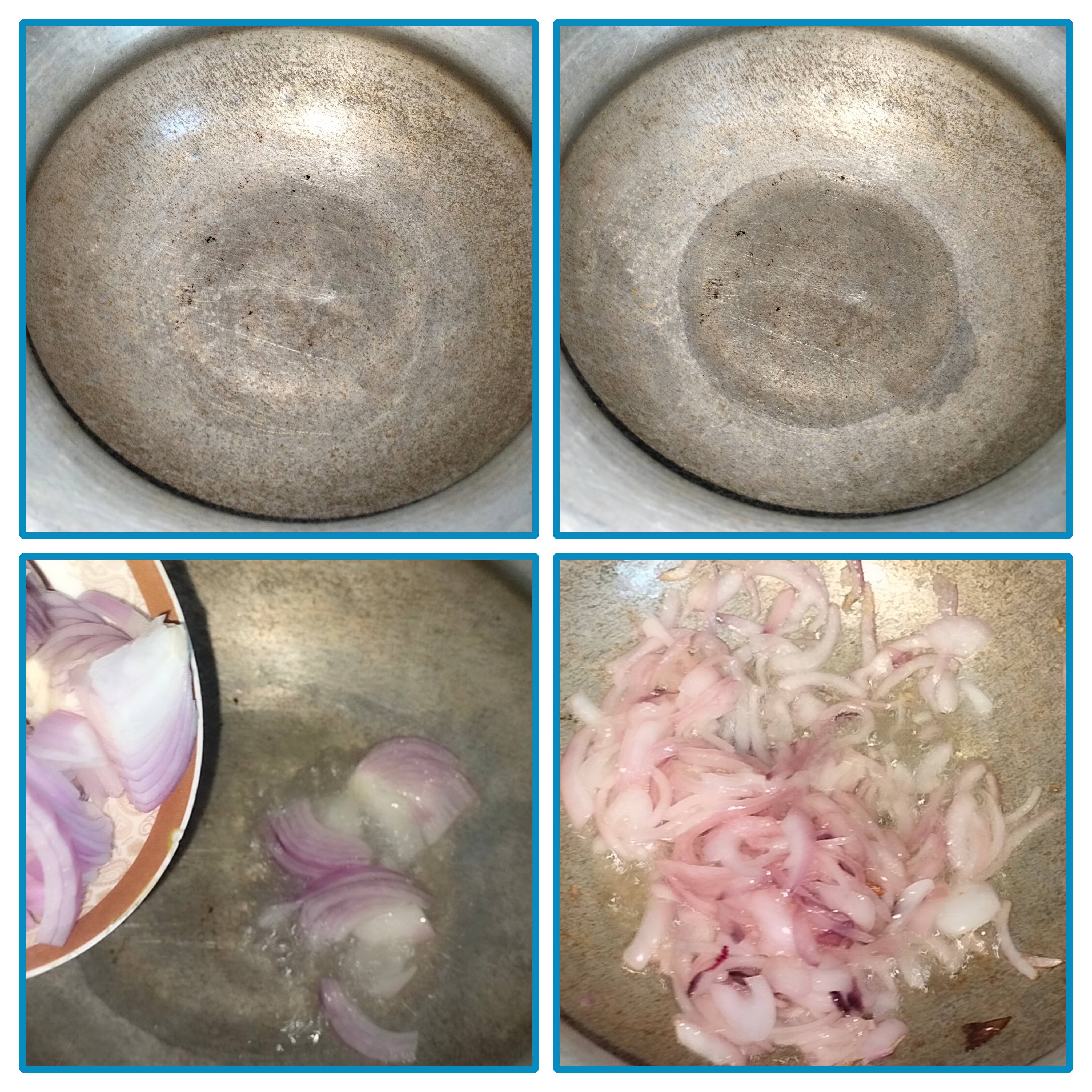 Then I put a pan on the stove. In it, I added some oil. Then I added chopped onions. Then I fried them a little.