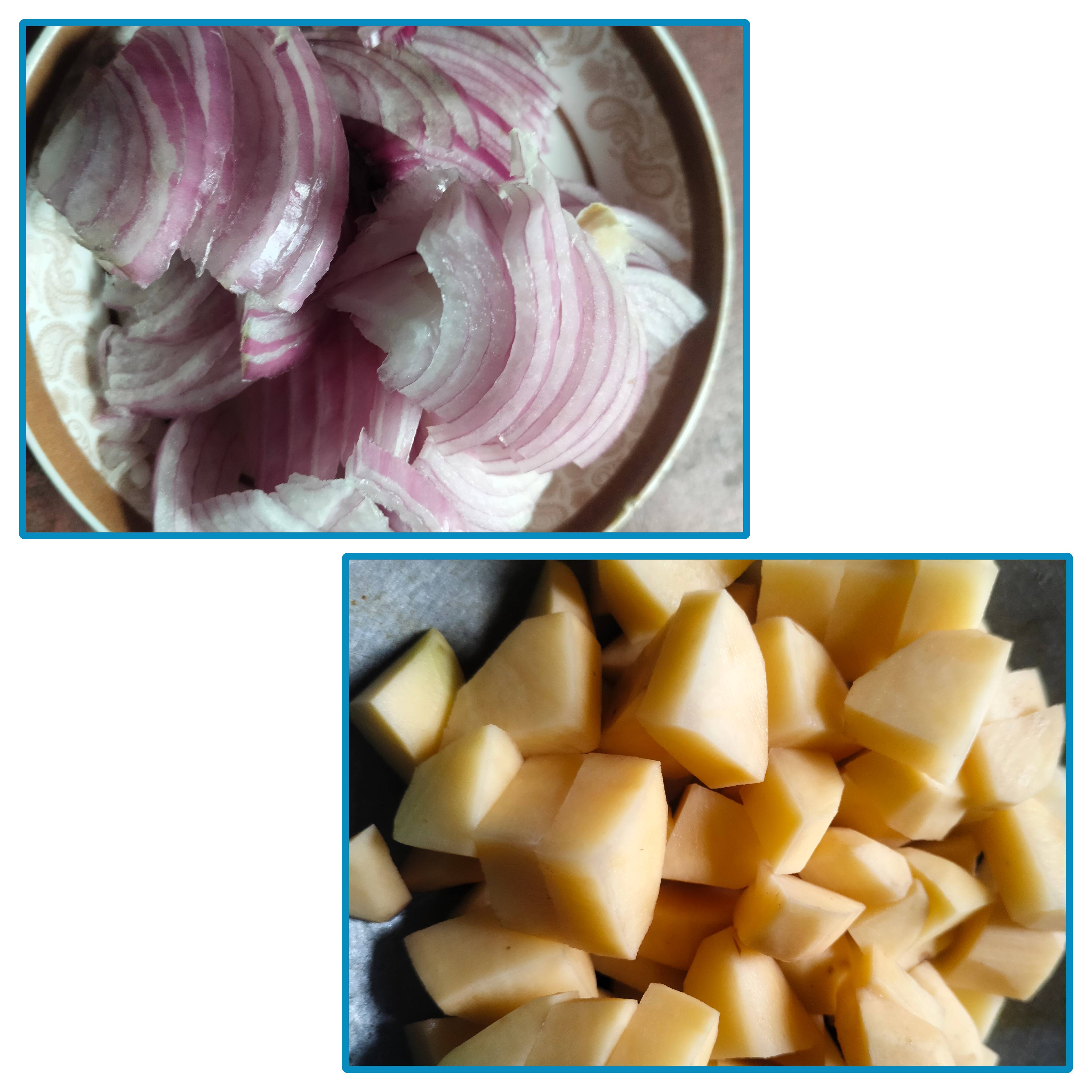 First, I cut the potatoes into small pieces. I also chopped the onions into small pieces. And I washed and cleaned them.