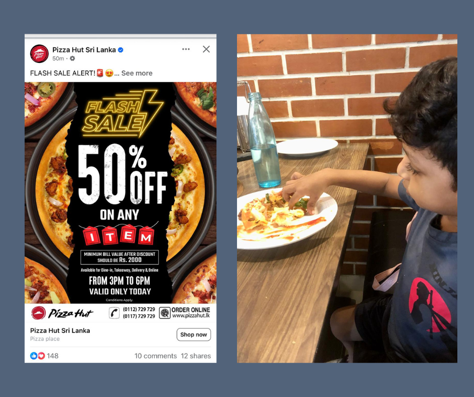 Later In the evening, when I scrolled through my Facebook wall there was a post showing a flash sale at Pizza Hut which was 50% off on any item! It was too good to miss, especially since we love pizza. After having a short nap, we decided to go. My dad was busy with some work, so it was just my mom, Vihan, and me. I did miss going out with my husband.