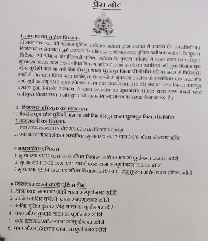के निकट पर्यवेक्षण में संपूर्ण जनपद में अपराध की रोकथाम व वांछित/वारंटी अभियुक्तों की गिरफ्तारी हेतु चलाए जा रहे अभियान के अंतर्गत आज दिनांक 20.05.22 को थाना सम्पूर्णानगर पुलिस द्वारा मु0अ0सं0 85/22 धारा 3/5/8 गौवधनिवरण अधि0 वांछित 5,000 रुपये के इनामिया अभियुक्त फिरोज पुत्र रईस कुरैशी नि0 शेरपुर थाना पूरनपुर जनपद पीलीभीत को गिरफ्तार किया गया। गिरफ्तार अभियुक्त के कब्जे से 01 अदद अवैध तमंचा 315 बोर व 02 अदद जिन्दा कारतूस 315 बोर व 01 अदद मोटर साइकिल (UP26Q 5512) सुपर स्पेलन्डर बरामद किया गया, जिसके संबंध में थाना सम्पूर्णानगर पर आर्म्स एक्ट की सुसंगत धाराओं में अभियोग पंजीकृत किया गया है। गिरफ्तार अभियुक्त को न्यायिक हिरासत में जेल भेजा जा रहा है।