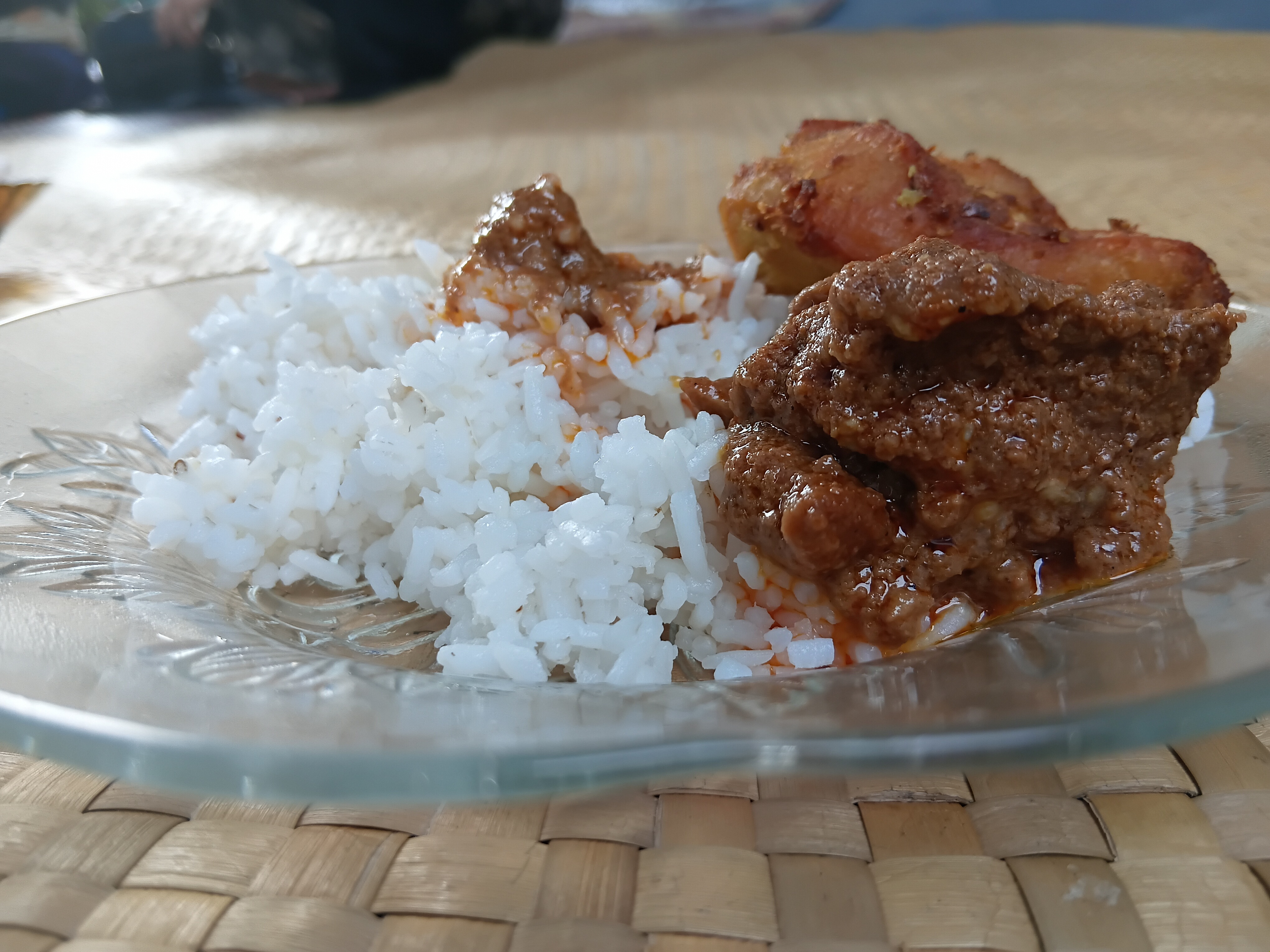 Di suatu siang yang tenang, di atas tikar anyaman yang sederhana namun penuh kehangatan, tersaji sepiring nasi putih hangat yang dipadukan dengan rendang daging sapi yang kaya rempah dan potongan ayam goreng yang menggoda selera. Aroma gurih dari santan dan bumbu khas Nusantara memenuhi udara, menggugah siapa saja yang duduk di sekitarnya.