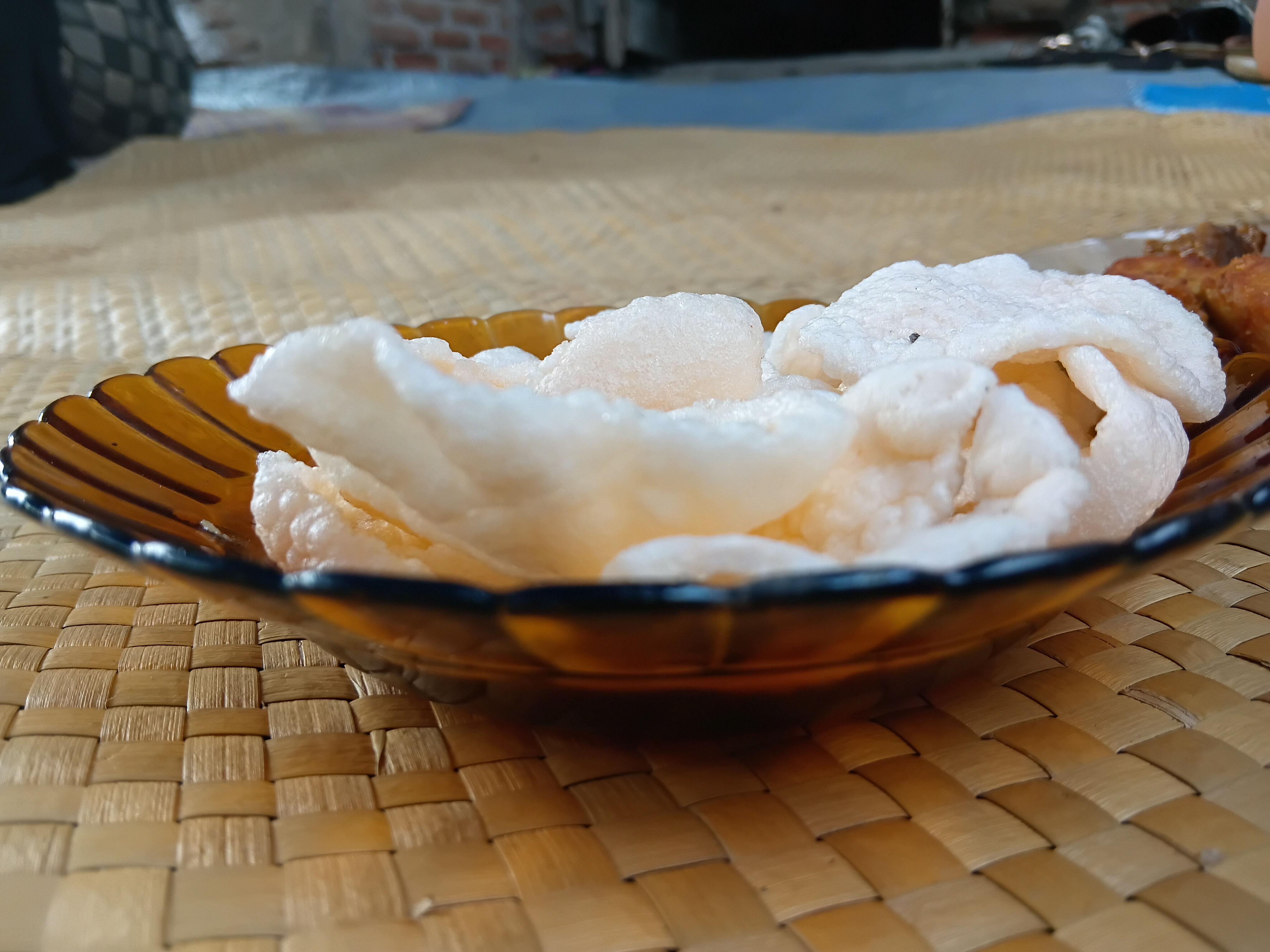 Di sisi lain, sepiring kerupuk putih renyah menanti untuk disantap, siap menjadi pelengkap sempurna yang menambah sensasi kriuk di setiap suapan. Suasana santai, mungkin di rumah atau saat berkumpul bersama keluarga, menjadikan momen makan ini terasa lebih dari sekadar mengisi perut ia menjadi bagian dari kebersamaan yang sederhana tapi berarti.