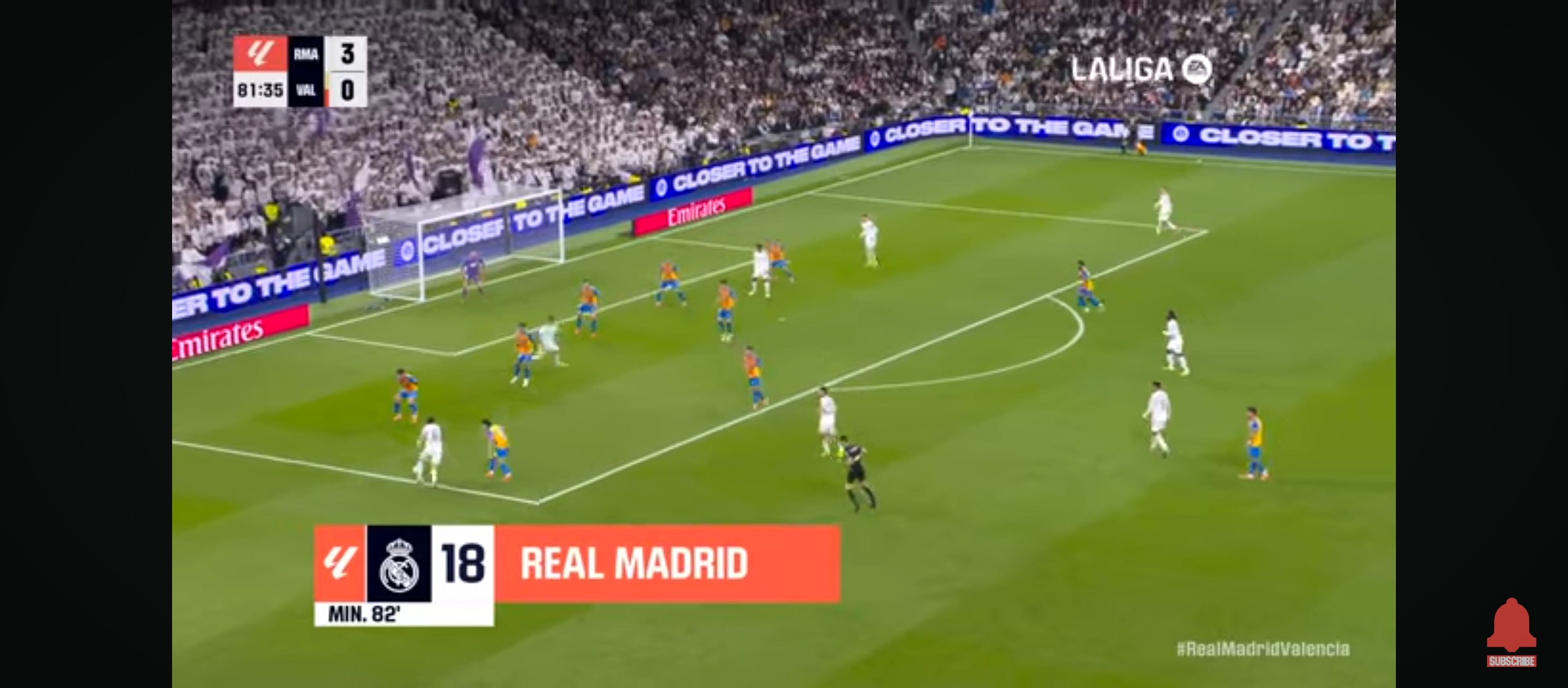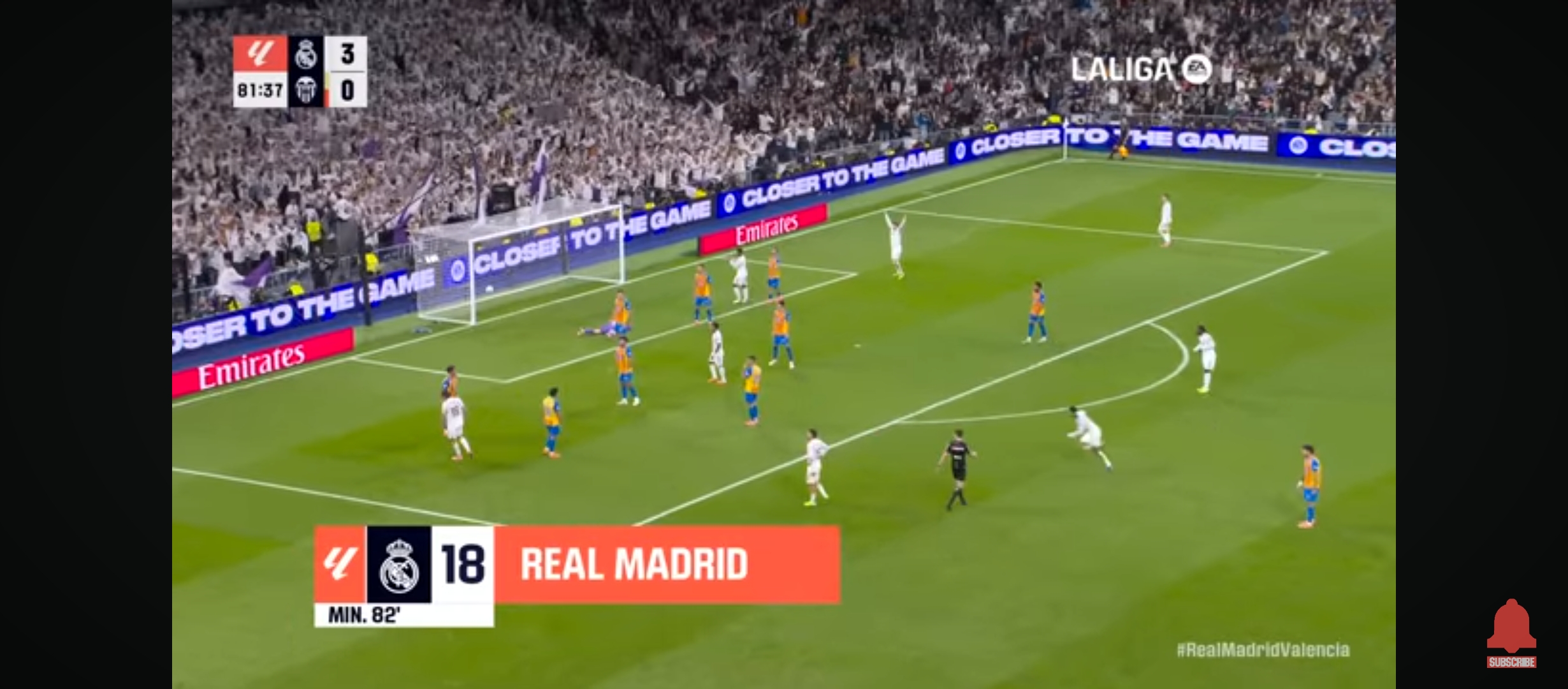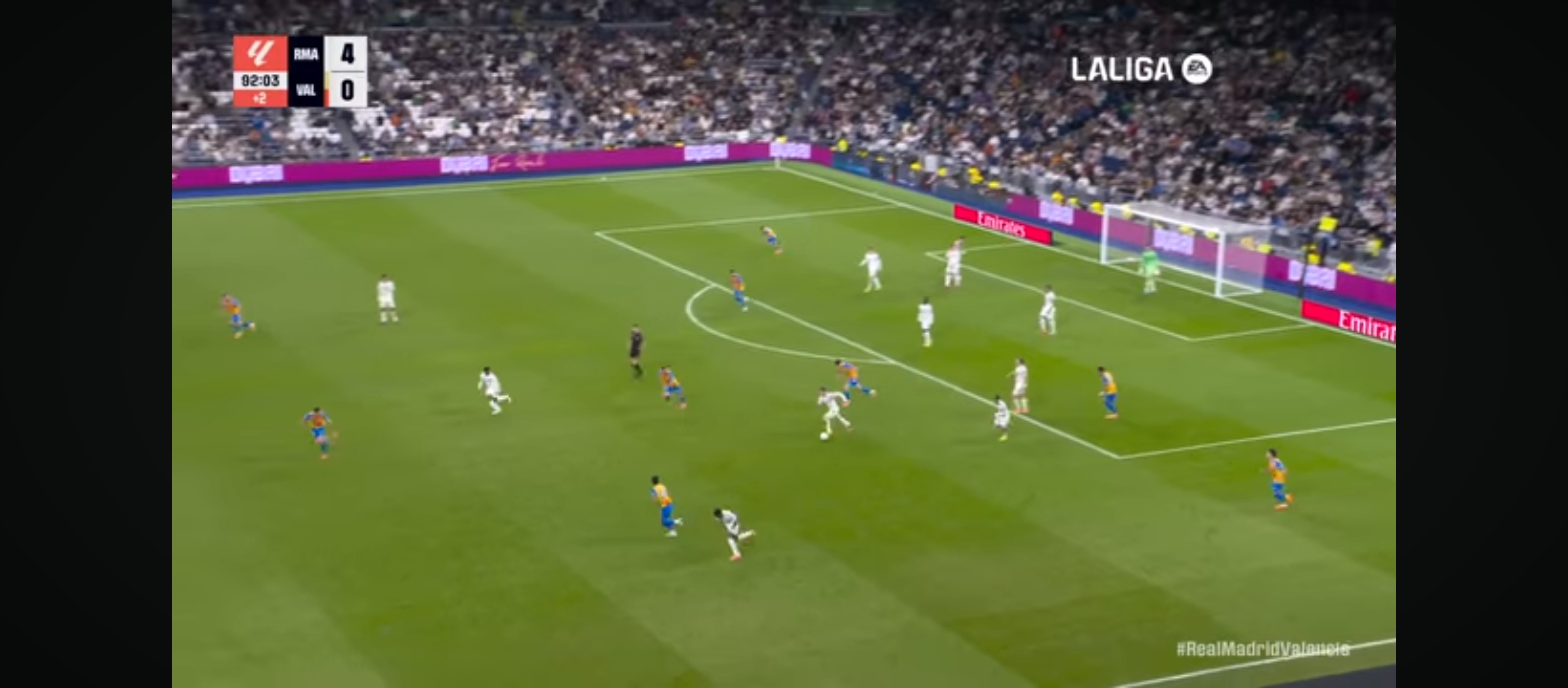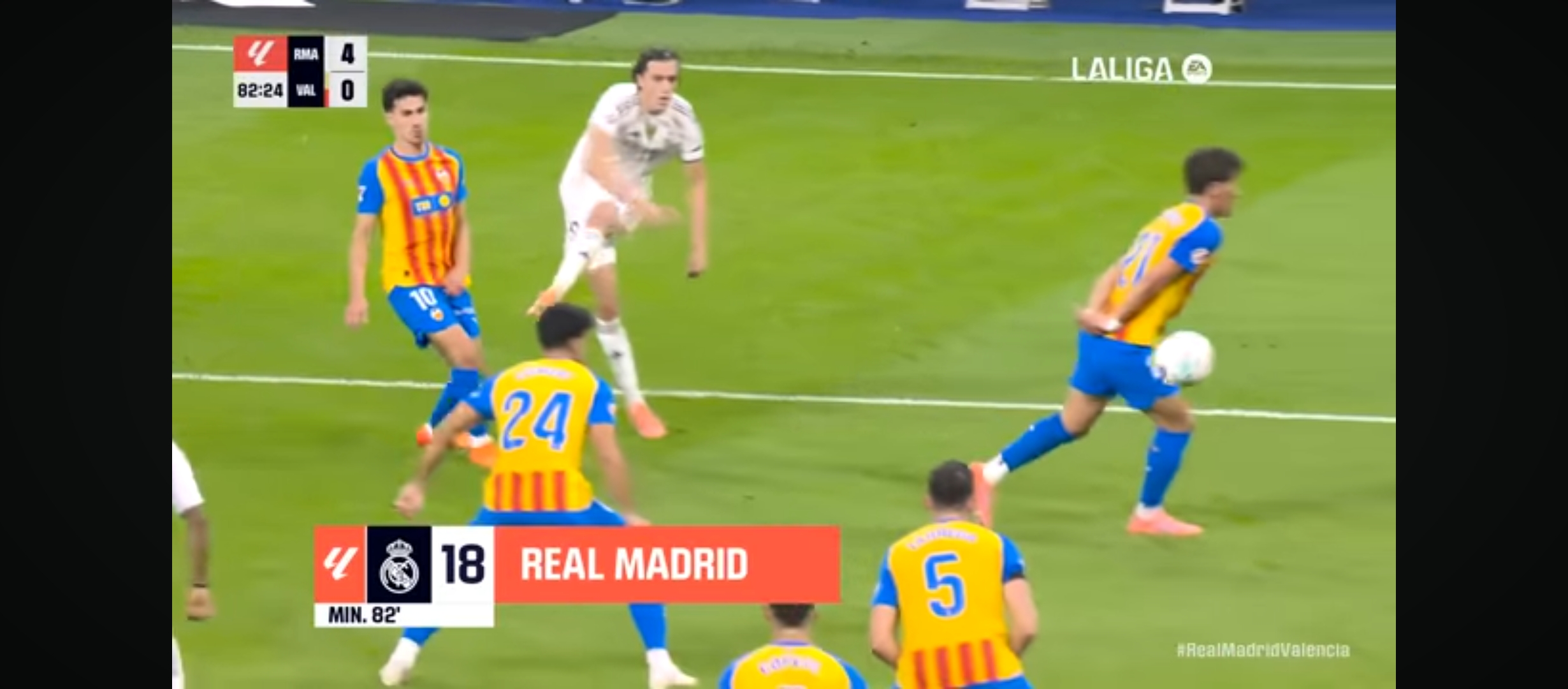 রিয়াল মাদ্রিদ প্রত‍্যাশিত ভাবে আক্রমণ করছিল না। কারণ ততক্ষণে তাদের তিন পয়েন্ট নিশ্চিত হয়ে গিয়েছে। ম‍্যাচের তখন ৮২ মিনিট। ডিবক্সের প্রায় বাইরে থেকে অসাধারণ একটা গোল করে মাদ্রিদের লেফট ব‍্যাক আলভারো ক‍্যারেরাস। এককথায় দৃষ্টিনন্দন এক দূরপাল্লার গোল। এটা রিয়াল মাদ্রিদের হয়ে প্রথম গোল। যেটা সত্যি স্মরণীয় করে রাখার মতো। রিয়াল মাদ্রিদ পুরোপুরি ৪-০ গোলে এগিয়ে গেল। ম‍্যাচের বাকি সময়ে আর কোন গোল না হল পুরোপুরি তিন পয়েন্ট নিয়ে মাঠ ছাড়ে রিয়াল মাদ্রিদ। এই নিয়ে লীগে ১১ ম‍্যাচে ১০ জয়ে ৩০ পয়েন্ট নিয়ে টেবিলের শীর্ষে রয়েছে রিয়াল মাদ্রিদ। আশাকরি এভাবেই মোমেন্টাম ধরে রাখতে পারলে এবার লীগ টাইটেল রিয়াল মাদ্রিদেই আসবে। পুরো ম‍্যাচে বেশ আধিপত্য নিয়ে খেলে মাদ্রিদ।