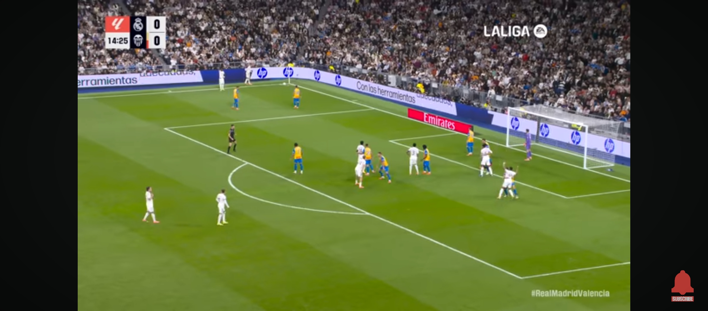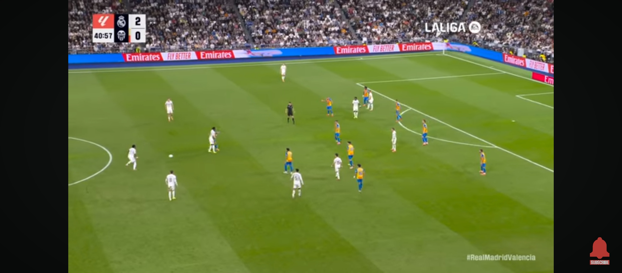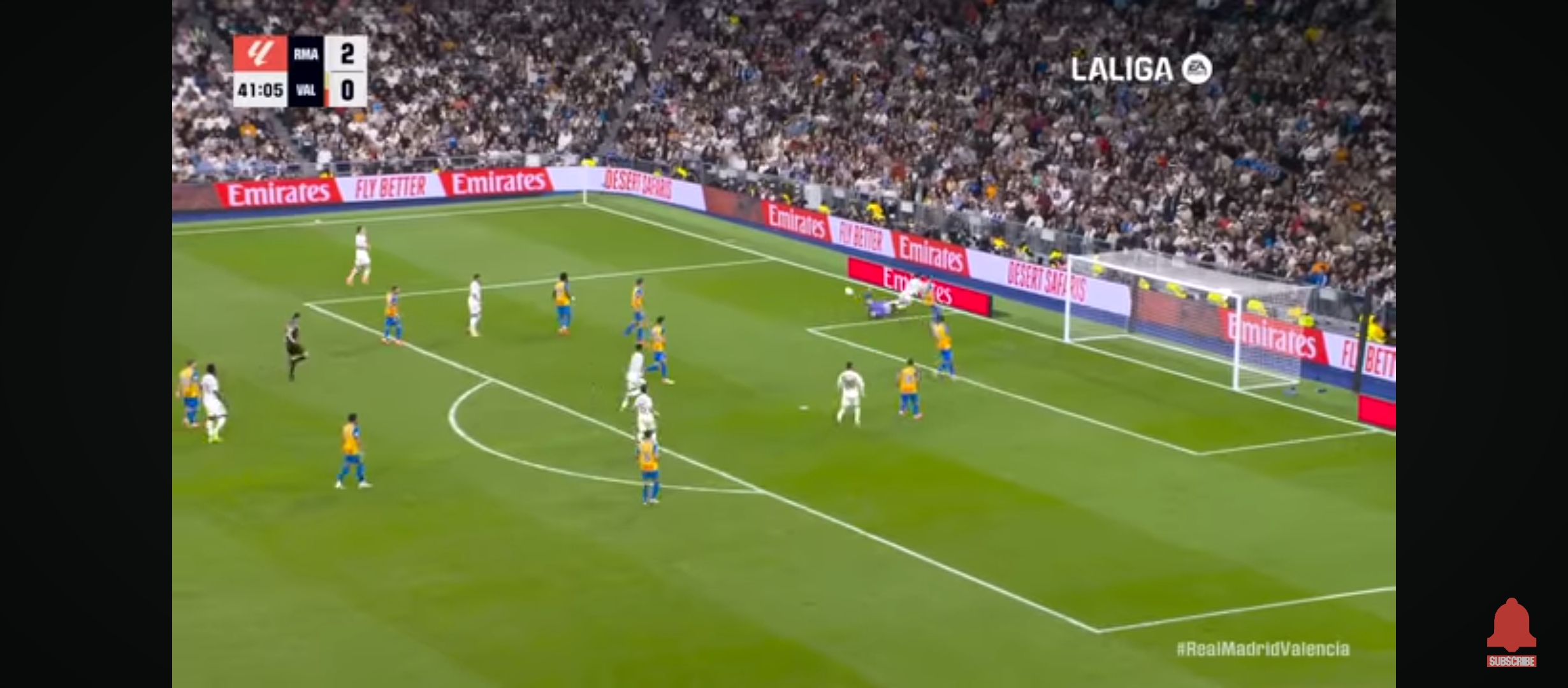ম‍্যাচের তখন ৪৩ মিনিট। প্রতিপক্ষের ডিবক্সের মধ্যে বল নিয়ে দারুণভাবে এগিয়ে যায় ভিনিসিয়াস। প্রতিপক্ষ গোলরক্ষক তাকে ফাউল করলে পেনাল্টি পেয়ে যায় রিয়াল মাদ্রিদ। এবার পেনাল্টি নিতে আসে ভিনিসিয়াস। তবে তিনি সেটা মিস করে বসে। গোল আর করতে পারে না। তবে এর একেবারে পরের মিনিটেই ফেদে ভালভার্দের অ‍্যাসিস্টে গোল করে জুড বেলিংহাম। ইঞ্জুরি থেকে ফিরেই যেন সে তার সেরা খেলাটা দেখানো শুরু করেছে। টানা দুই ম‍্যাচে দুই গোল। হাফ টাইমের আগেই রিয়াল মাদ্রিদ পুরোপুরি ৩-০ গোলে এগিয়ে যায়। এটাই প্রমাণ করে রিয়াল মাদ্রিদ ঠিক কতটা আক্রমণাত্মক খেলেছে। প্রথমার্ধের খেলা শেষ হয়। দ্বিতীয়ার্ধে মাঠে নেমে স্বাভাবিকভাবেই রিয়াল মাদ্রিদ খেলাটা কিছুটা ধীর করে দেয়।