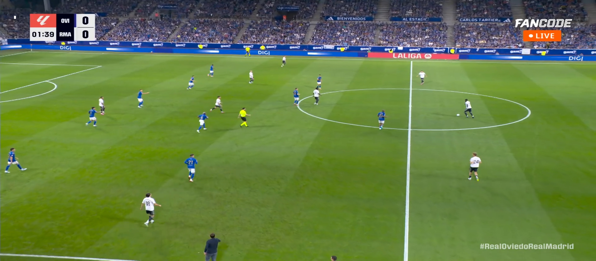 খেলার শুরু থেকেই রিয়াল মাদ্রিদ একটা গতিশীল ফুটবল খেলতে থাকে। অর্থাৎ গত ম্যাচের সম্পূর্ণ বিপরীত ফুটবল টা খেলতে থাকে তারা। একের পর এক আক্রমণ একের পর এক দারুণ সব বল প্লেয়িং। সবমিলিয়ে চমক দেখাতে শুরু করে তারা। অনেক দিন পর রদ্রিগো শুরু করে বেশ দারুণ কিছু শর্ট নেয়। কিন্তু সেগুলো গোলরক্ষক সেভ দিয়ে দেয়। ফলে কোন গোল হয়নি তার পা থেকে। তবে মাঝে মাঝে দুই একটা ভালো অ্যাটাক রিয়াল ওবেইদা করছিল। কিন্তু সেরকম কোন লাভ হচ্ছিল না। ম্যাচের তখন ৩৮ তম মিনিটের খেলা চলছে। আর্দা গুলারের অ্যাসিস্টে দারুণ এক গোল করে কিলিয়ান এমবাপ্পে। ০-১ গোলে এগিয়ে যায় রিয়াল মাদ্রিদ। প্রথমার্ধে আর কোন গোল হয়নি। দ্বিতীয়ার্ধে ঠিক আগের মতোই শুরু করে রিয়াল মাদ্রিদ।