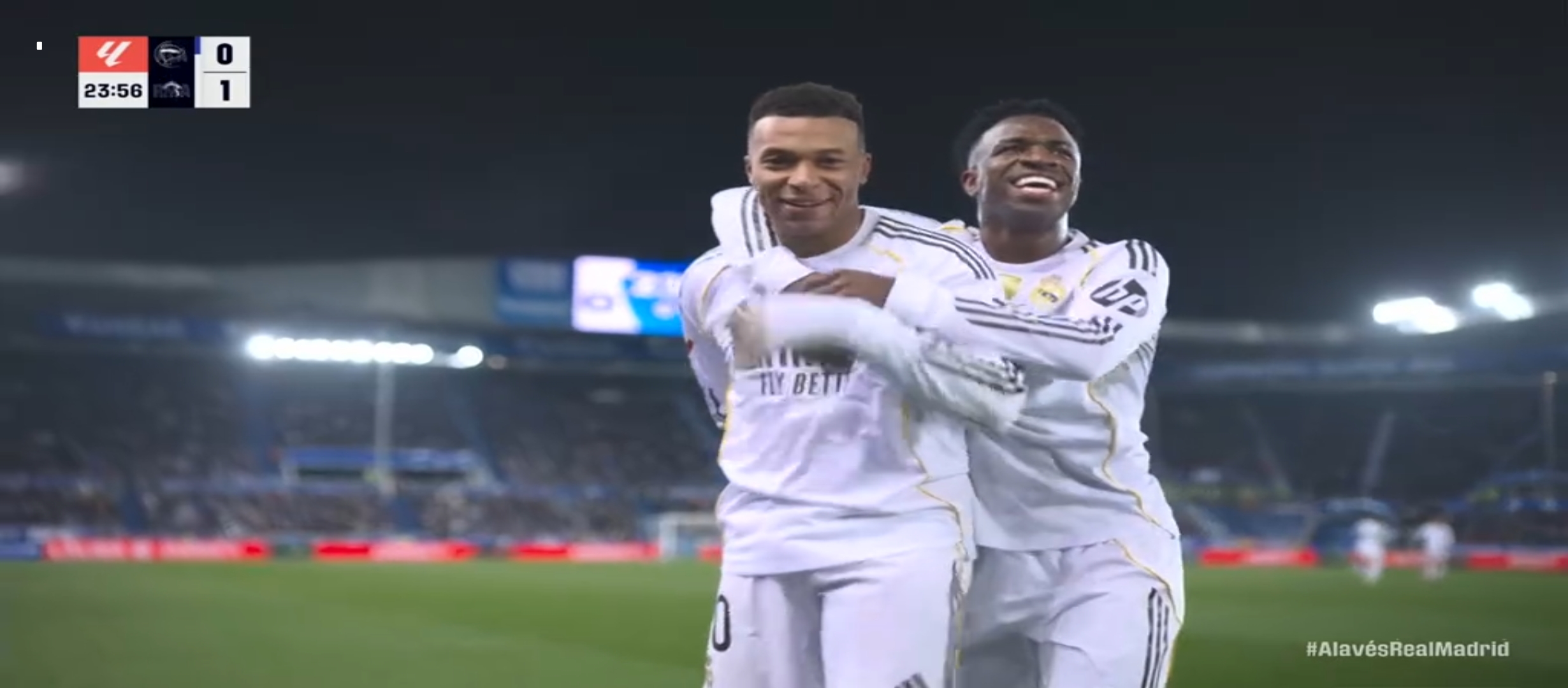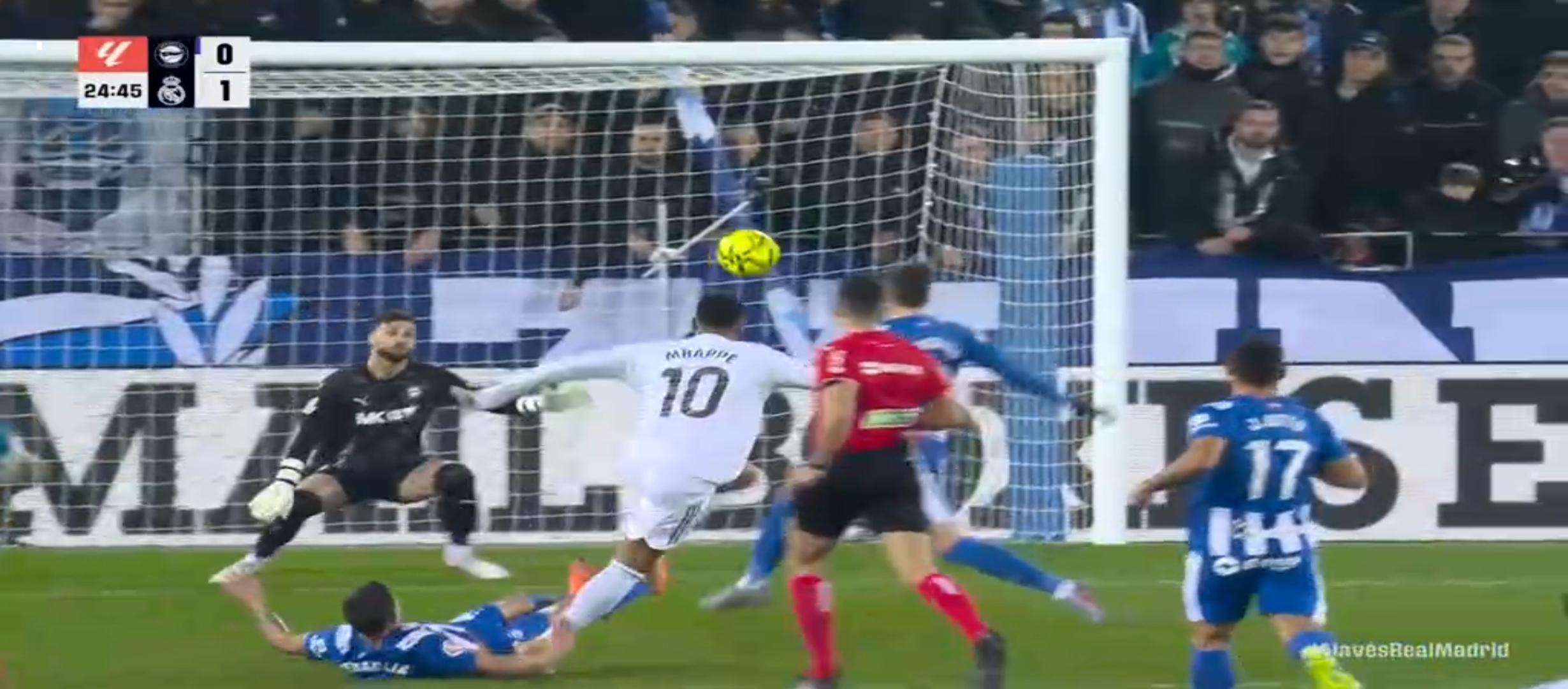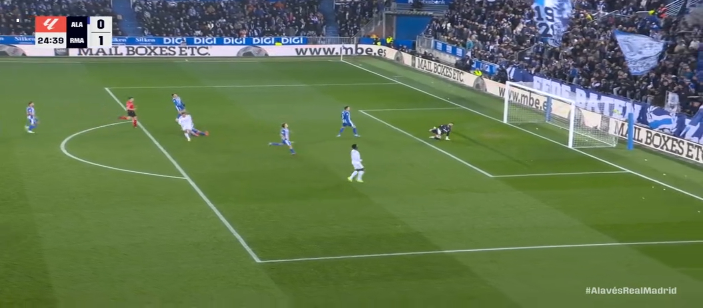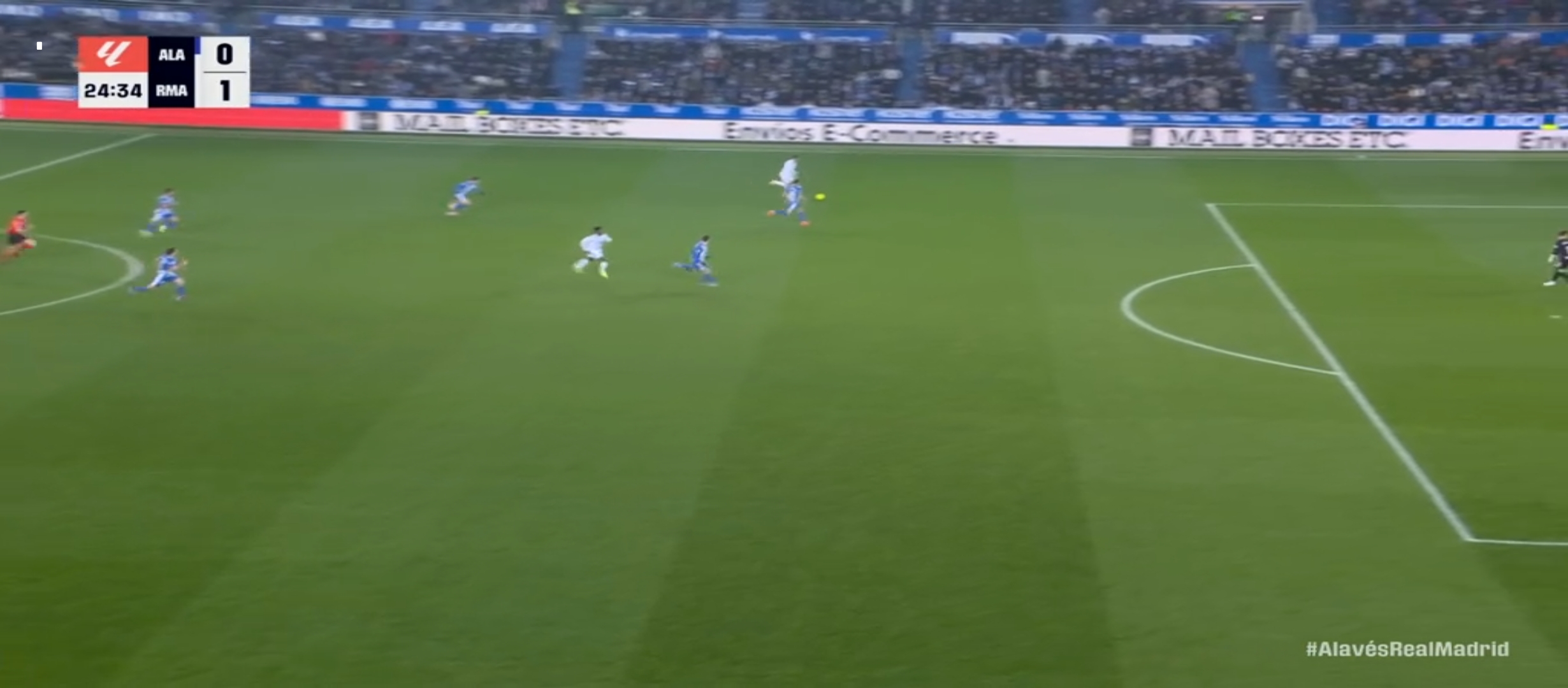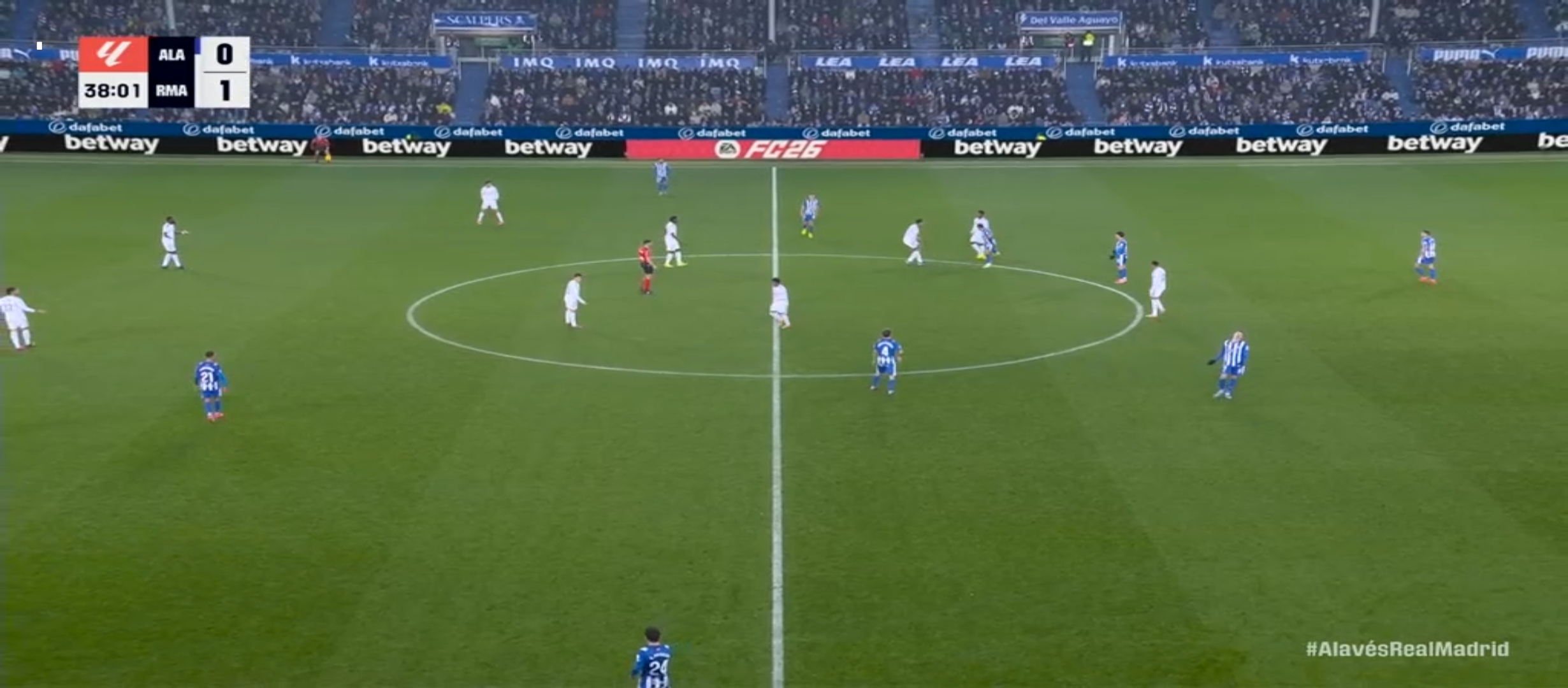 রিয়াল মাদ্রিদ ৪-১-৪-১ ফর্মেশনে মাঠে নামে। অন্যদিকে প্রতিপক্ষ আলাভেস এর ফর্মেশন ছিল ৪-৪-২। আলাভেস একেবারে লো ব্লক খেলার পরিকল্পনা করেই মাঠে নেমেছিল। ফলে রিয়াল মাদ্রিদের যে গোল করতে কষ্ট হবে এটা বোঝা যাচ্ছিল। খেলা শুরু হয় বাংলাদেশ সময় রাত ২ টার সময়। খেলার শুরুতে কিছুটা এলোমেলো খেলতে থাকে রিয়াল মাদ্রিদ। সেভাবে বিল্ড আপ করে আক্রমণে যেতে পারছিল না মোটেই। একেবারে খাপছাড়া খেলা হচ্ছিল। এরই মধ্যে এমবাপ্পে কিছু সুযোগ পেয়ে দুই একটা শর্ট নিলেও কোন লাভ হয়নি। অর্থাৎ গোল করতে পারেনি। ম্যাচের ২৪ মিনিট তখন। বেলিংহাম মাঝ মাঠ থেকে দারুণ এক থ্রু পাস দেয় এমবাপ্পে কে। এমবাপ্পে কয়েকজন খেলোয়ার কে ড্রিবল করে দারুণ একটা শর্ট করে গোল করে।