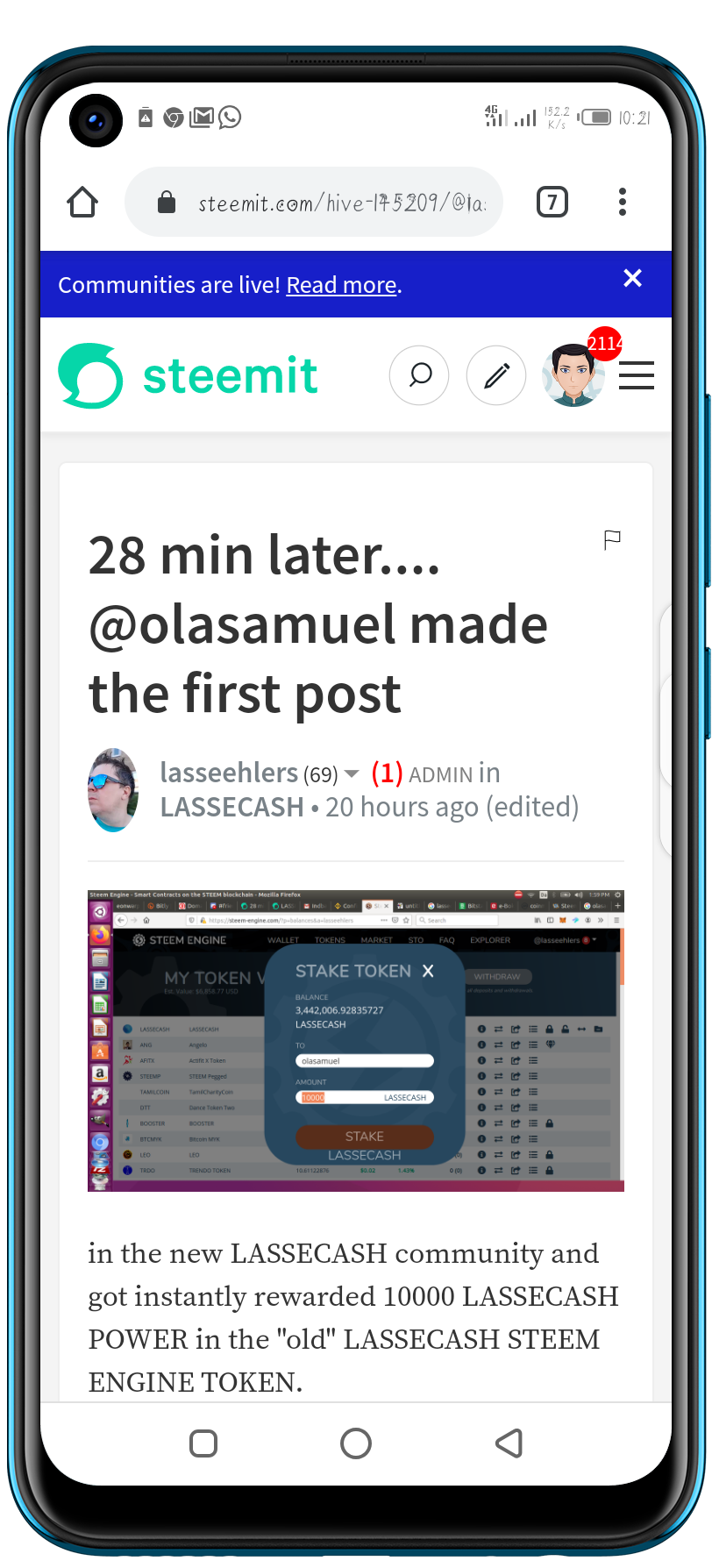 Without wasting much of my time, I quickly subscribed to Lassecash community and dropped a post in there quickly. Few moments after that, @lasseehlers gave my post a 100% upvote and also fulfilled his promise by sending me a 10,000 Lassecash Power.