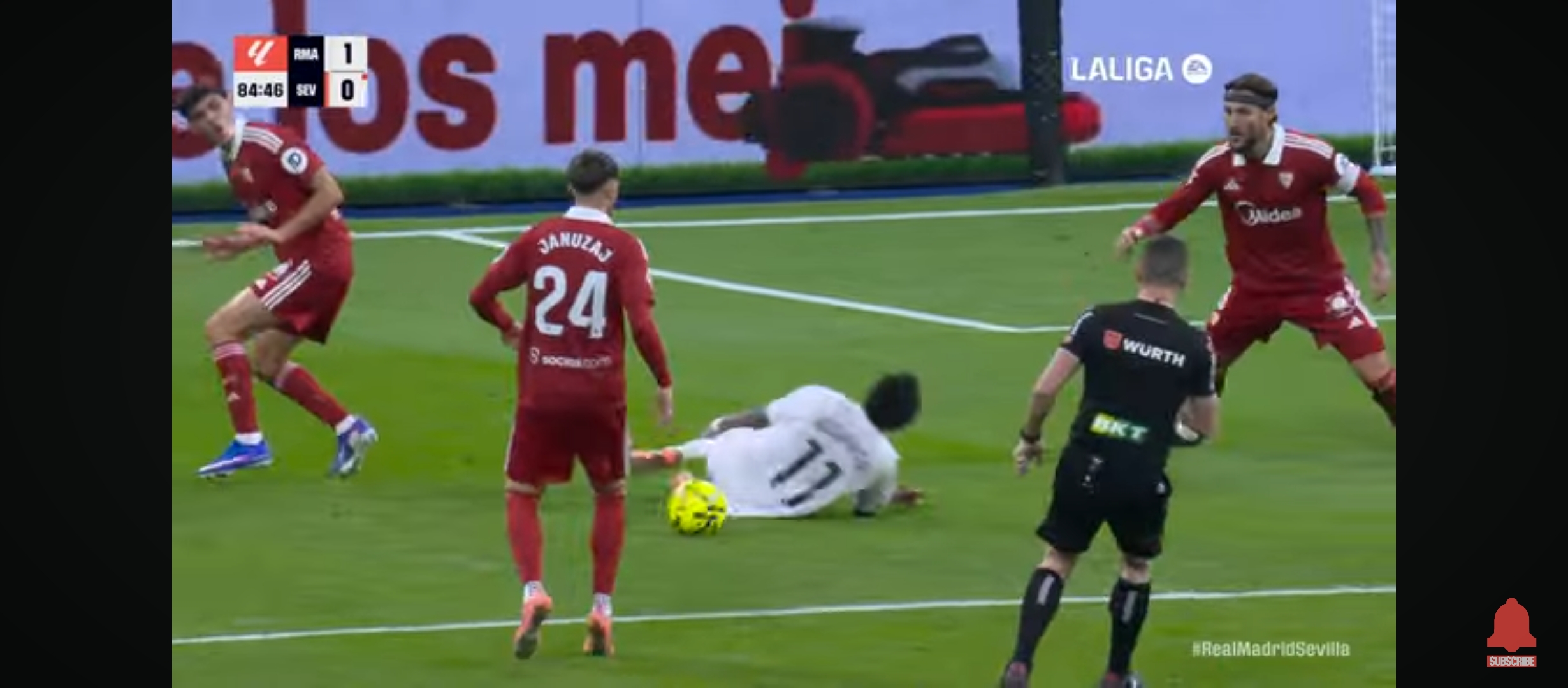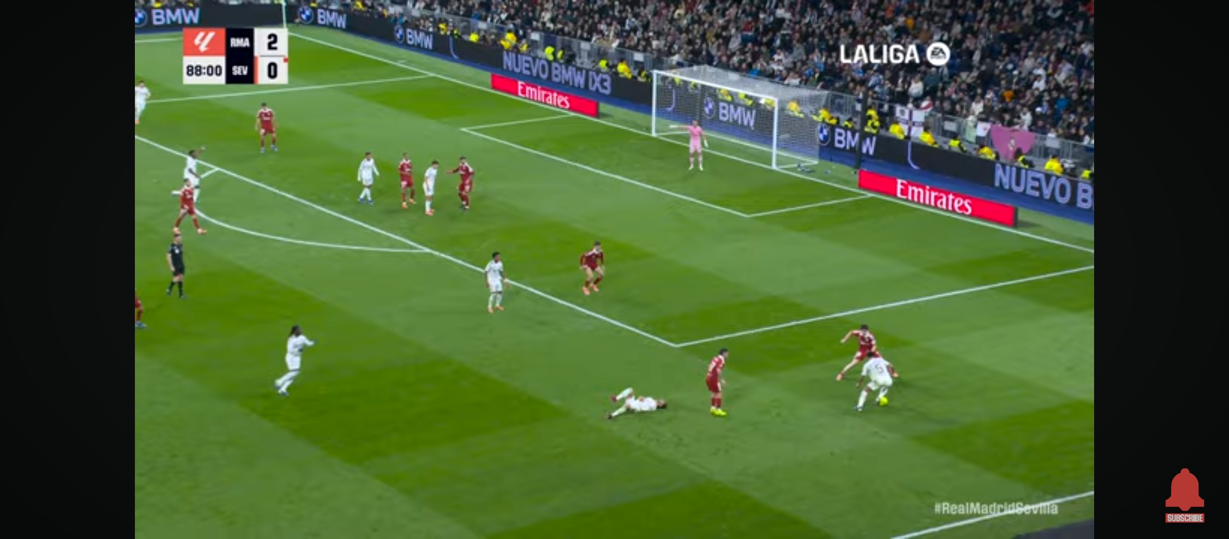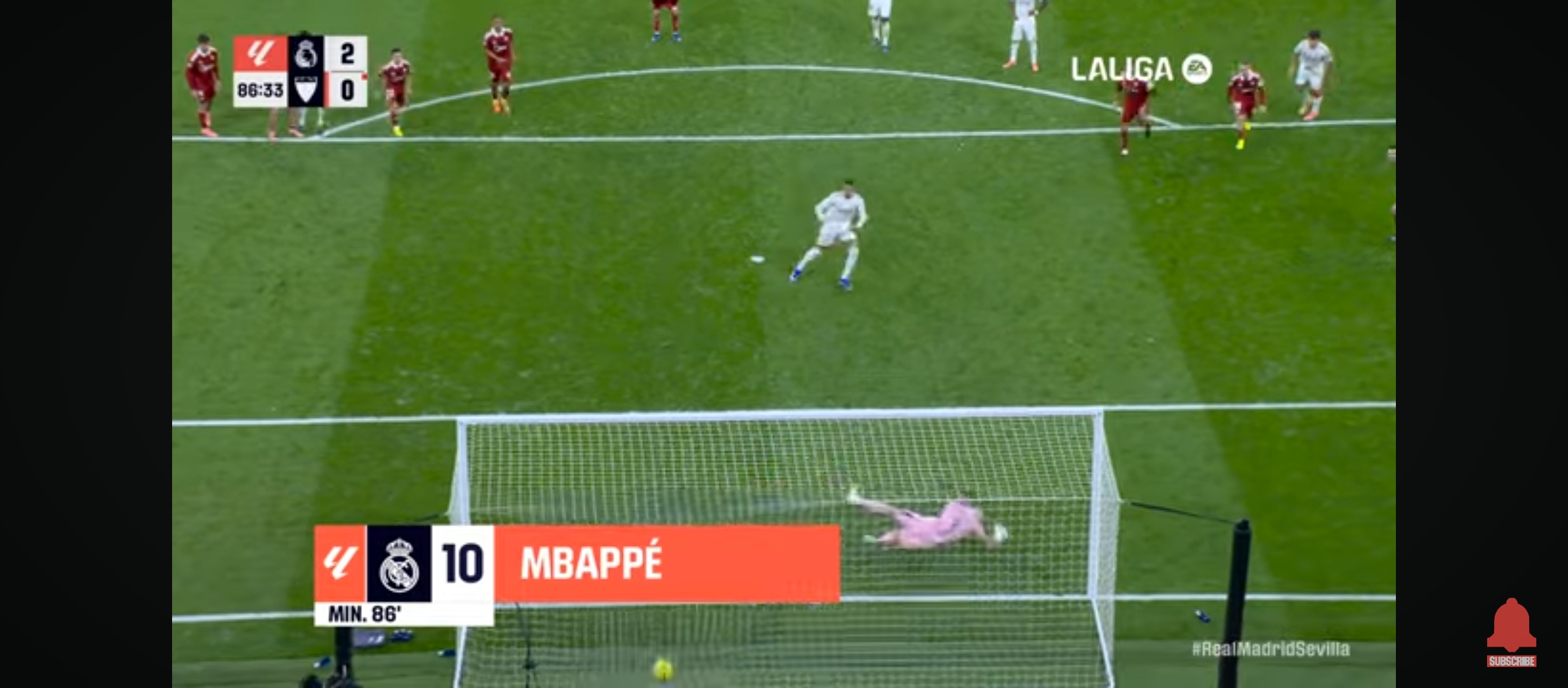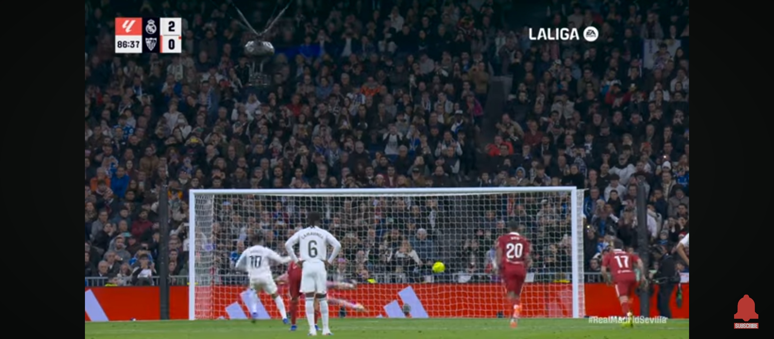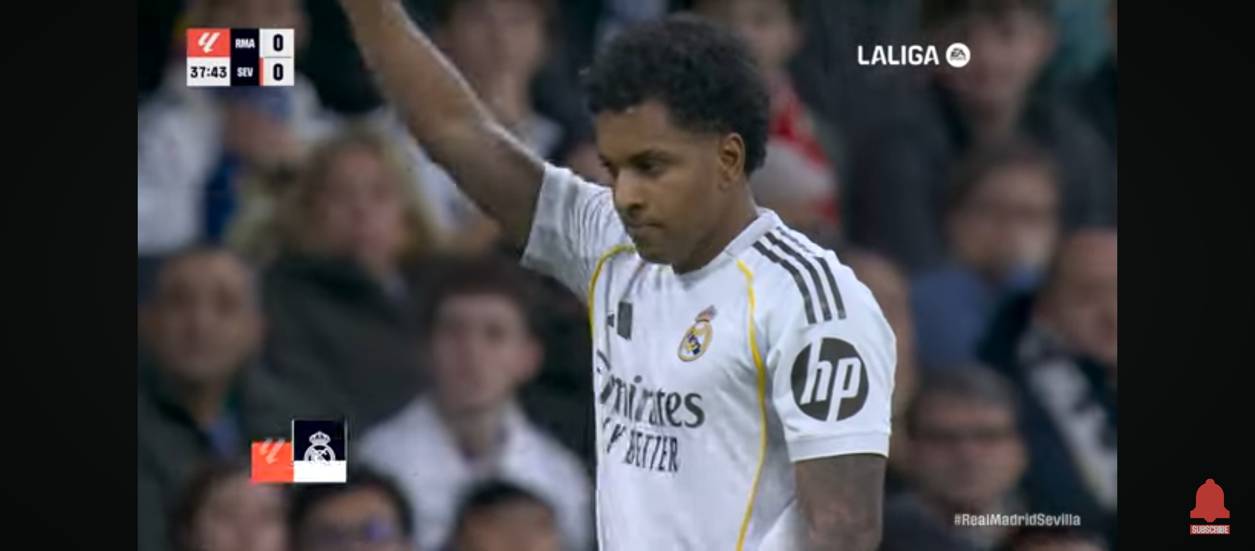 রিয়াল মাদ্রিদ ১-০ তে এগিয়ে যায়। প্রথমার্ধের খেলা শেষ হয়। দ্বিতীয়াধেও খেলা আগের মতোই চলতে থাকে। উল্লেখ্য এই ম্যাচেও রদ্রিগো ছিল বেশ আগ্রাসী। সে দারুণ খেলছিল। দারুণ সব সুযোগ তৈরি করছিল মাঠের মধ্যে বল নিজের দখলে রাখার জন্য স্কিল প্রদর্শন সবকিছুই করছিল সে। ম্যাচের ৬৮ মিনিটের সময় বেলিংহামকে ফাউল করে সেভিয়ার মারাচাও। আগে একটা হলুদ কার্ড দেখাই সে লাল কার্ড পায়। এবং সেভিয়া পরিণত হয় ১০ জনের দলে। তখন রিয়াল মাদ্রিদের আক্রমণের গতি আরও বেড়ে যায়। ফলাফল ম্যাচের ৮৫ মিনিটের সময় রদ্রিগো দারুণ ভাবে বলটা নিয়ে ডিবক্সে ঢুকে যায়। তাকে ফাউল করে সেভিয়ার খেলোয়ার রা। পেনাল্টি পেয়ে যায় রিয়াল মাদ্রিদ। পেনাল্টি নিতে আসে কিলিয়ান এমবাপ্পে।