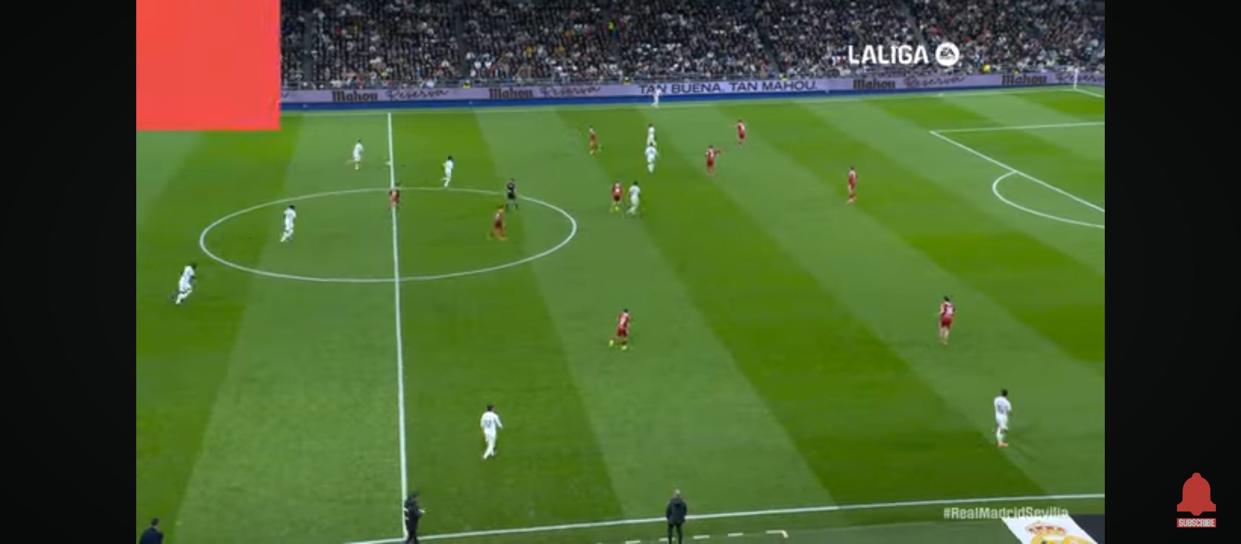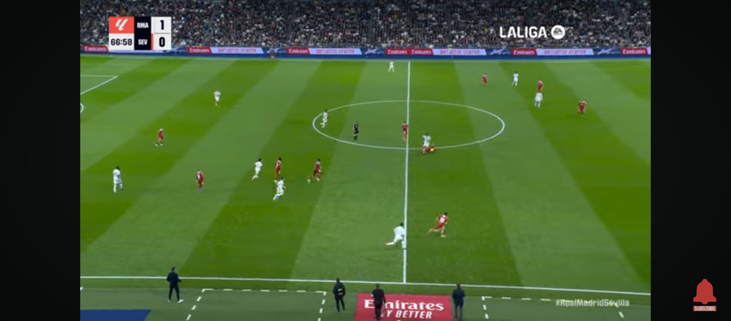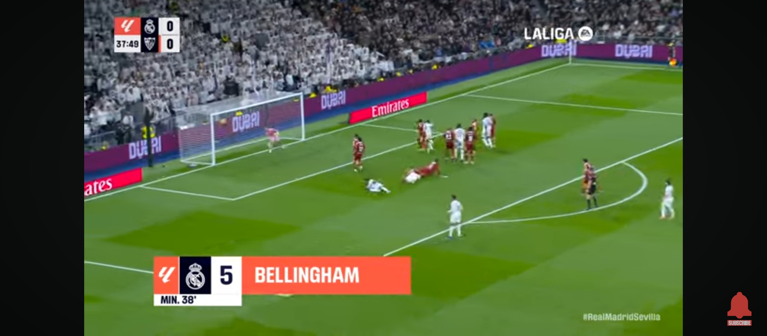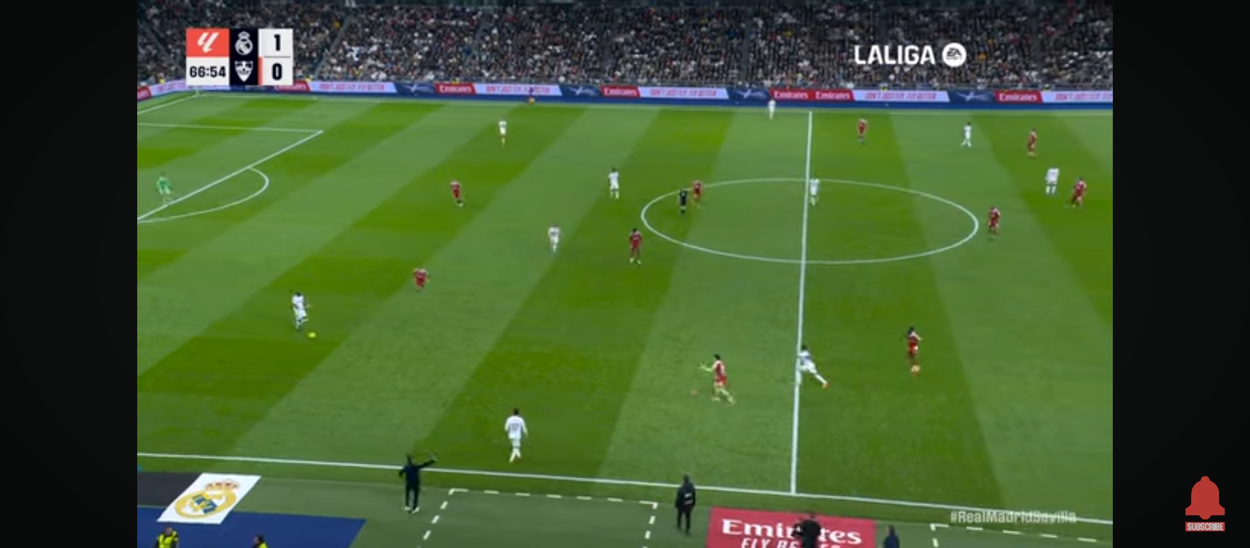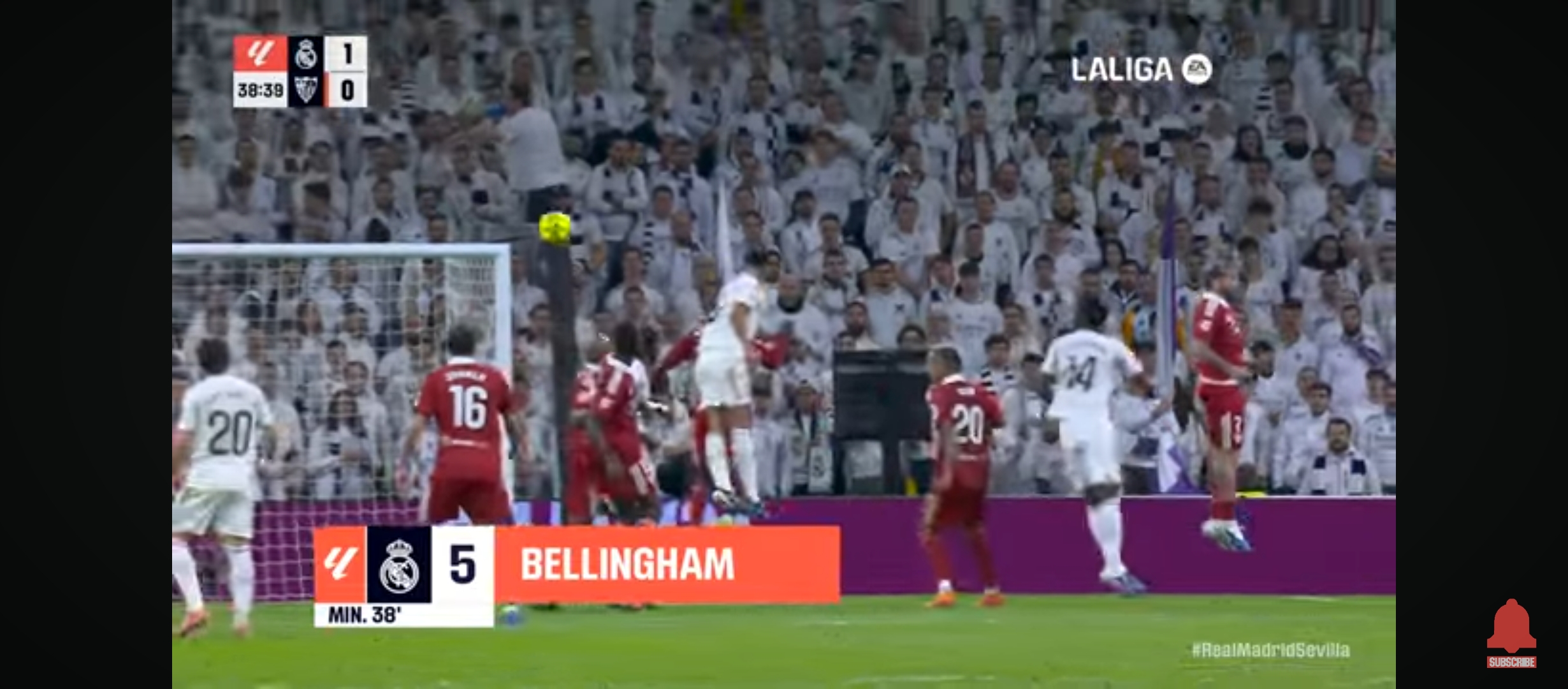 ইদানিং তুলনামূলক ছোট দলগুলো রিয়ালের সাথে লো ব্লকে খেলছে। তাদের রক্ষণভাগে বেশি খেলোয়ার রাখছে। এতে করে মাদ্রিদের গোল করা কষ্ট হয়ে যাচ্ছে। যদি স্বাভাবিক খেলে এই দলগুলো তাহলে রিয়ালের আক্রমণভাগ আটকানো যাবে না। যাইহোক খেলা শুরু হয় বাংলাদেশ সময় রাত ২ টার সময়। ম্যাচের শুরু থেকেই মোটামুটি গুছিয়ে খেলছিল রিয়াল মাদ্রিদ। একের পর এক আক্রমণ চালিয়ে যাচ্ছিল। কিন্তু সেই কাঙ্ক্ষিত ফিনিশিং এর অভাবে গোলের দেখা পাচ্ছিল না মোটেই। অন্যদিকে সেভিয়া দলটাও কিছু আক্রমণ করছিল। ম্যাচের ৩৮ মিনিটের সময় ডিবক্সের বেশ কিছুটা বাইরে থেকে একটা সেট পিচ পায় রিয়াল মাদ্রিদ। সেটা নিয়ে যায় রদ্রিগো। রদ্রিগো সেটা দারুণ ভাবে ডিবক্সের মধ্যে রাখে। এবং সেই বল থেকে হেড দিয়ে গোল করে জুড বেলিংহাম।