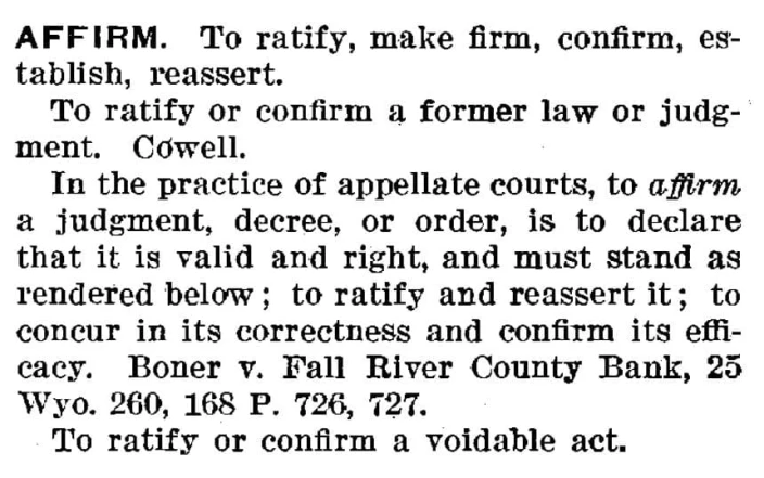 Two words stand out in the definition of the word Affirm. These are ratify and confirm.