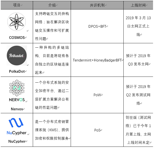 要实现跨链互操作的Cosmos、声称可一键发链的PolkaDot、试图解决公链“不可能三角”的Nervos,和专注于代理重加密技术的NuCypher。