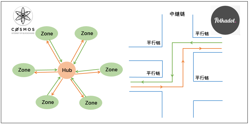 PolkaDot中的平行链可类比Cosmos的Zone;中继链可类比Hub,起到连接平行链的作用。但两者不同的是,平行链的账本以及记账人都由PolkaDot提供,它链上的区块由中继链给出的验证组进行验证及确定。