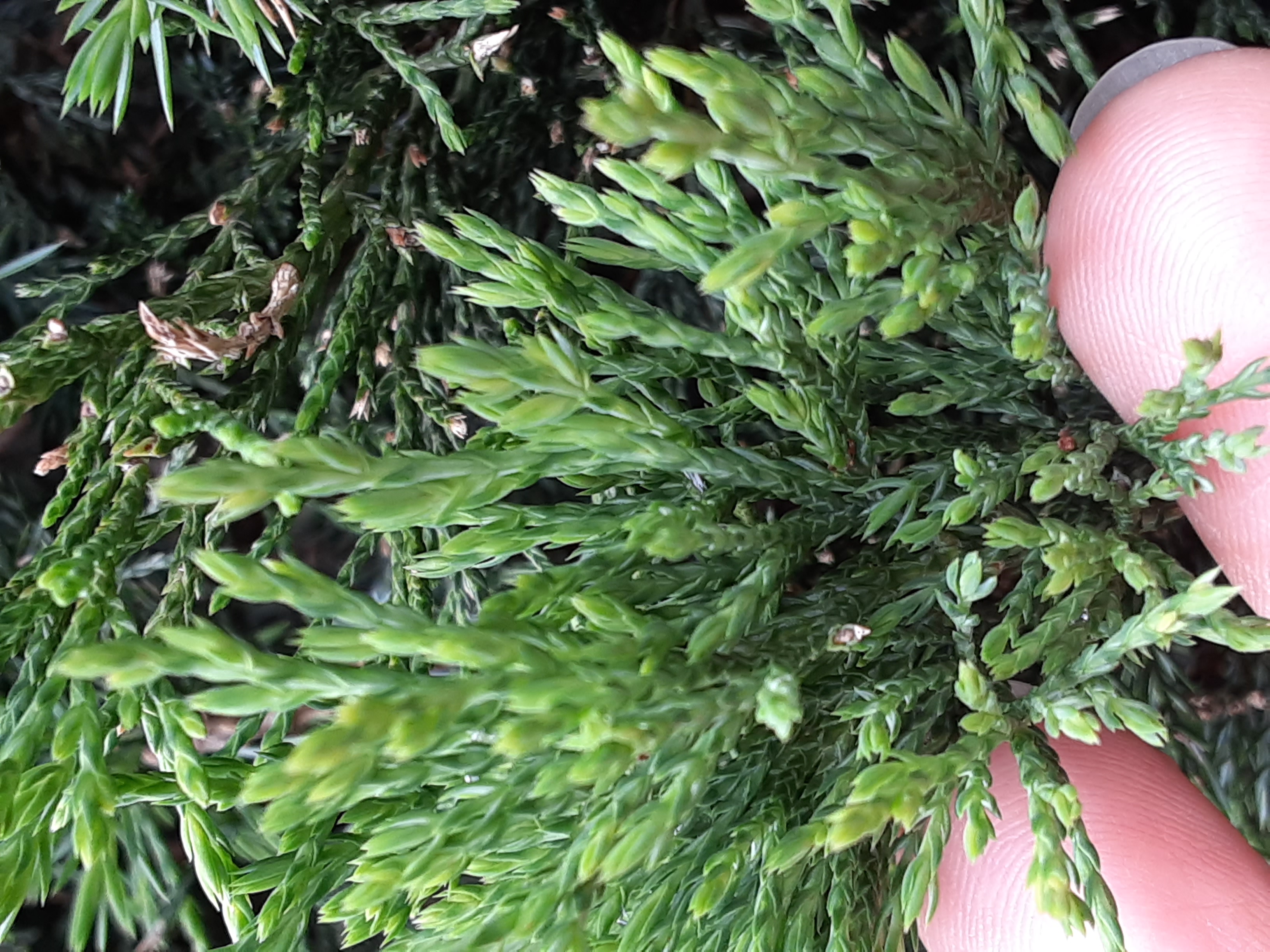 The leaves grow in pairs, and the mature leaf blades are scale-like.
