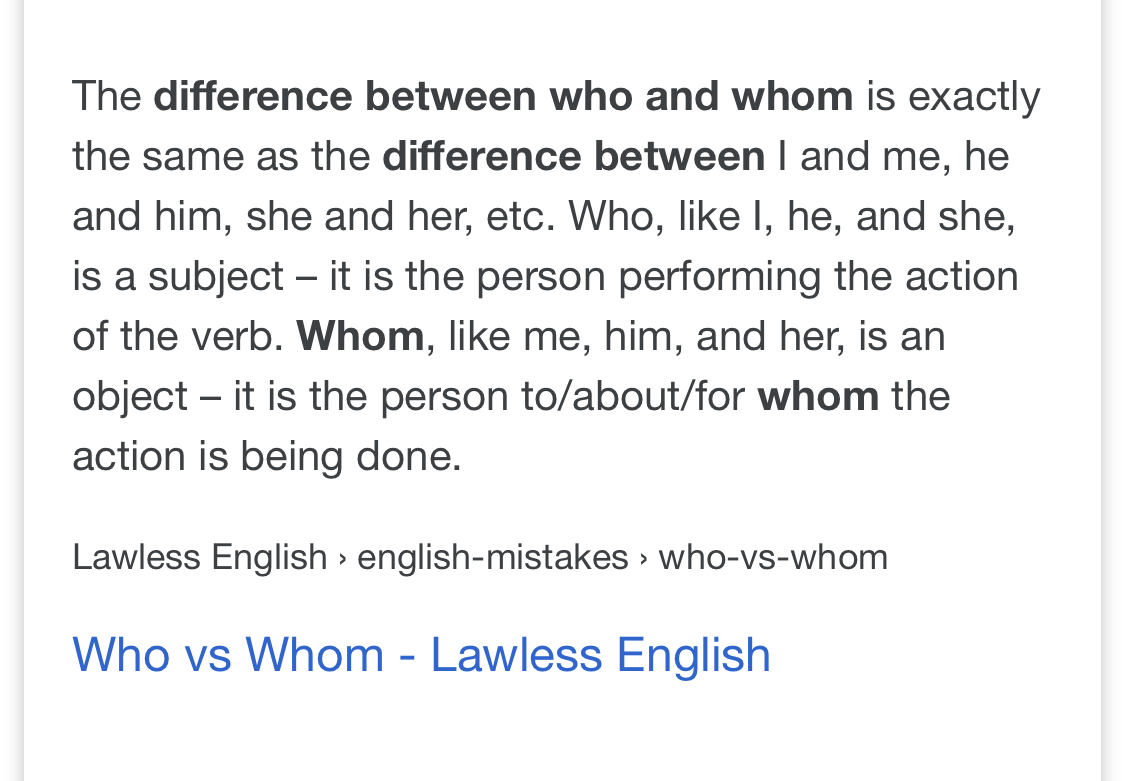 If I hesitate on whom, I nearly ever get it right the first time. Who petrifies me even more though because it’s the difference between me & I??? When in doubt use who for me and whom for you, maybe Racking my brain on whom for way too long? or is it who? ut-oh just confused myself. It’s a hard word that’s fosho. Not as bad as all of your you’re problems, not mine!” :D/s