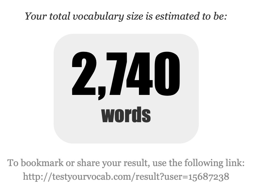 昨天,我在网上测了一下自己的单词量,只有2740个了。想当年咱也是词汇量过6000的人,这几年不怎么用英语,直接还给老师了。