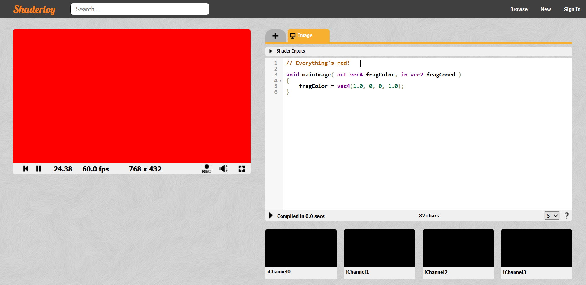 We're going to use Shadertoy, a wonderful web-based environment which sets up a quad for us, accepts our shader program, and renders the result.