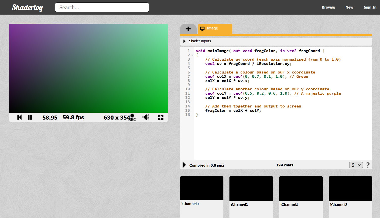 Granted, it's not doing anything particularly exciting yet. Next episode, we'll introduce animation, by using another handy input provided by Shadertoy. Stay tuned!