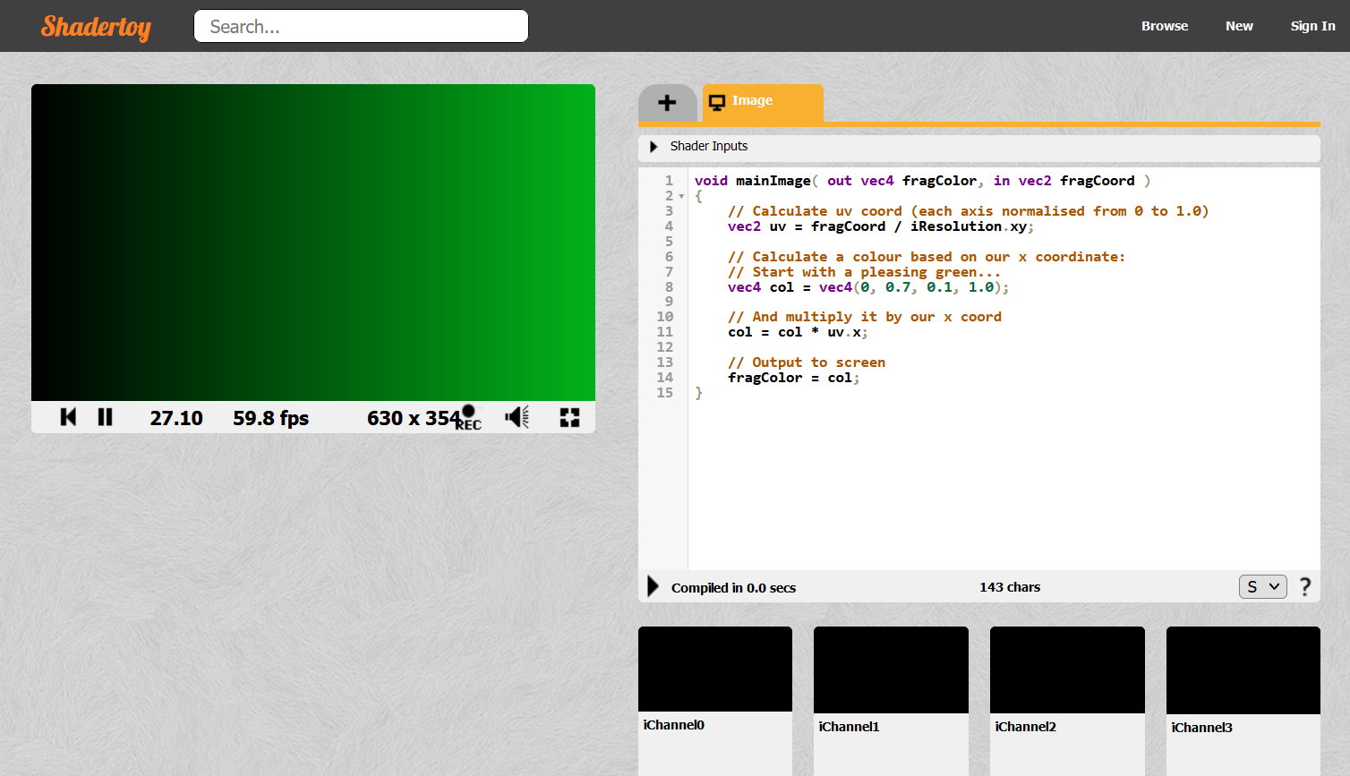 So, having created a vec4 to hold our RGBA colour, we then multiply it by whatever the current x coordinate is. Since x varies between 0 and 1.0, that will leave our little pixel completely black when x is 0 (left-hand edge), completely green when x is 1.0 (right-hand edge), and a proportionally darker shade of green anywhere in between.