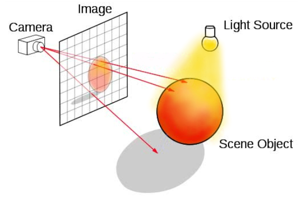 In the image above, every pixel in the image plane has a separate ray passing through it to check for object collisions, but only 3 are shown for example.